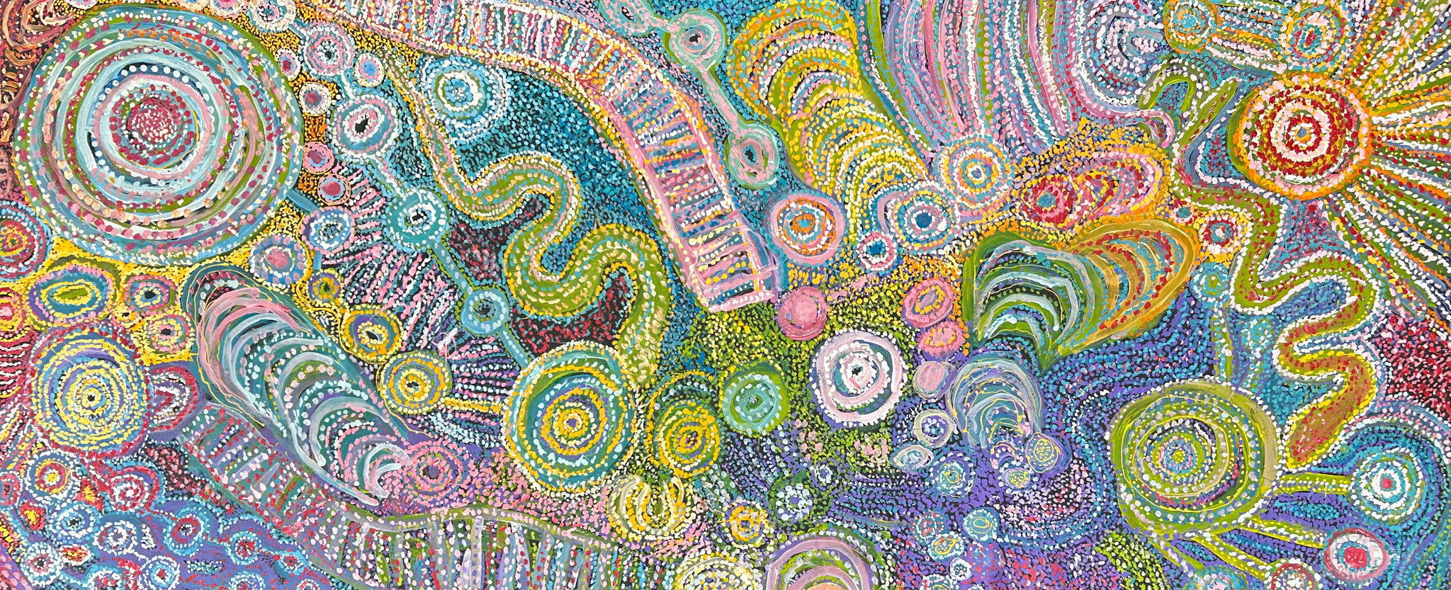 "Grandmother's story of two sisters, Wanyinta and Alartjatjarra, who, along with their husbands, travelled the lands in search of food. The sisters would hunt and gather food, but one day decided to eat some of it before returning to their husbands. This caused their husbands to turn into water snakes and swallow the sisters in anger. "