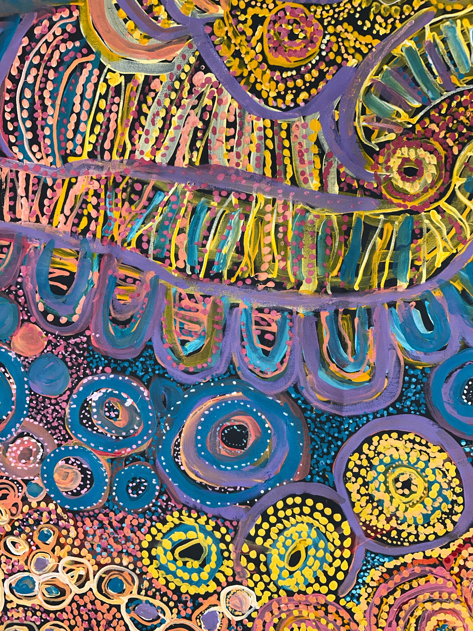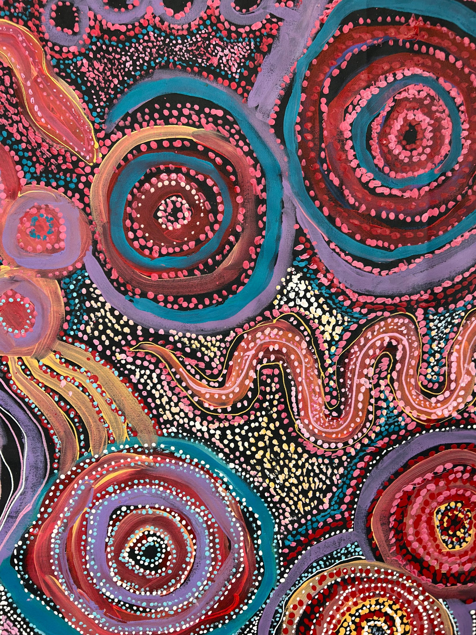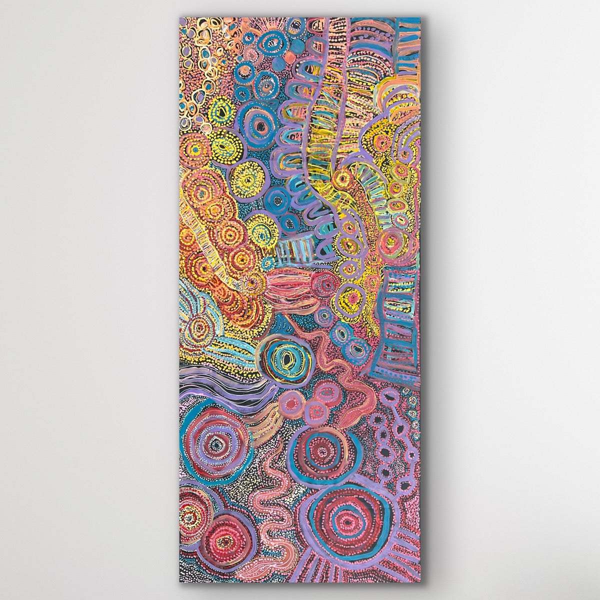 "Grandmother's story of two sisters, Wanyinta and Alartjatjarra, who, along with their husbands, travelled the lands in search of food. The sisters would hunt and gather food, but one day decided to eat some of it before returning to their husbands. This caused their husbands to turn into water snakes and swallow the sisters in anger. "