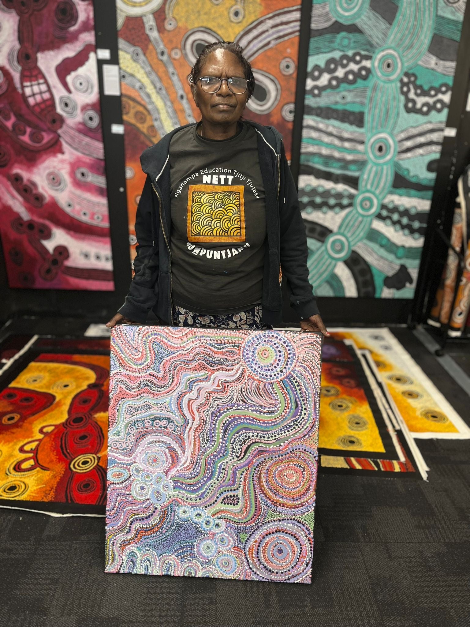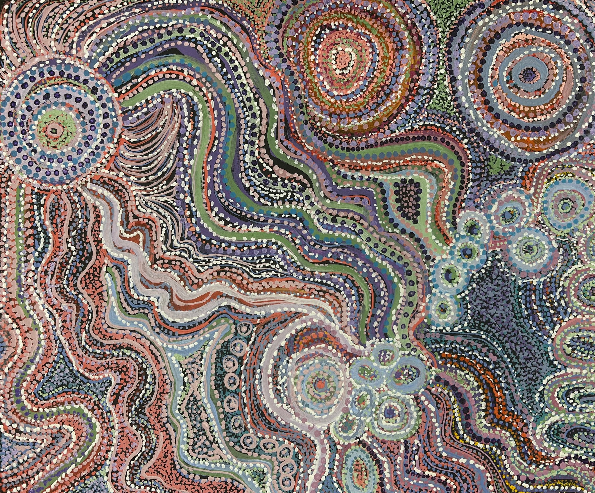 "Grandmother's story of two sisters, Wanyinta and Alartjatjarra, who, along with their husbands, traveled the lands in search of food. The sisters would hunt and gather food, but one day decided to eat some of it before returning to their husbands. This caused their husbands to turn into water snakes and swallow the sisters in anger. "
