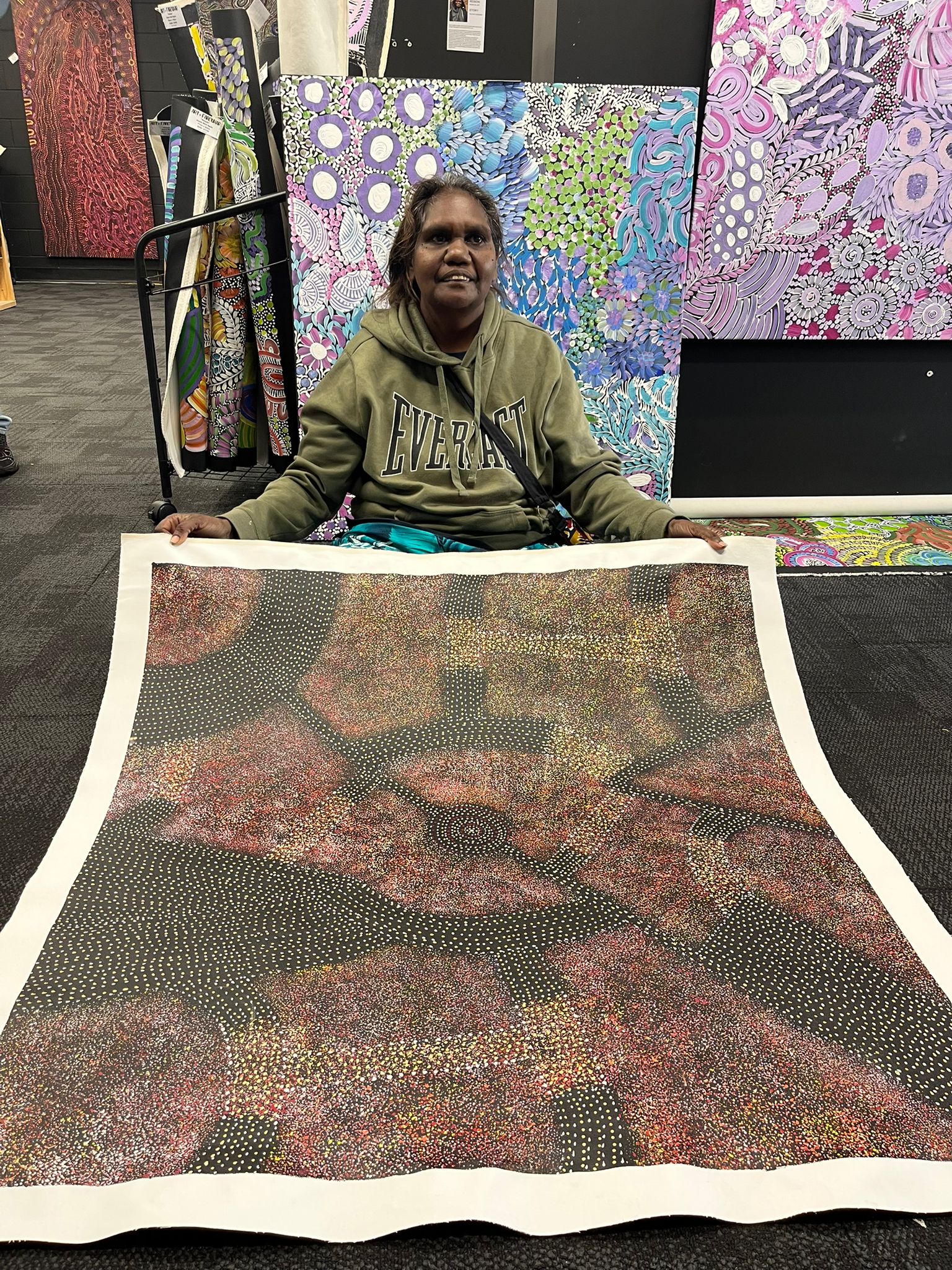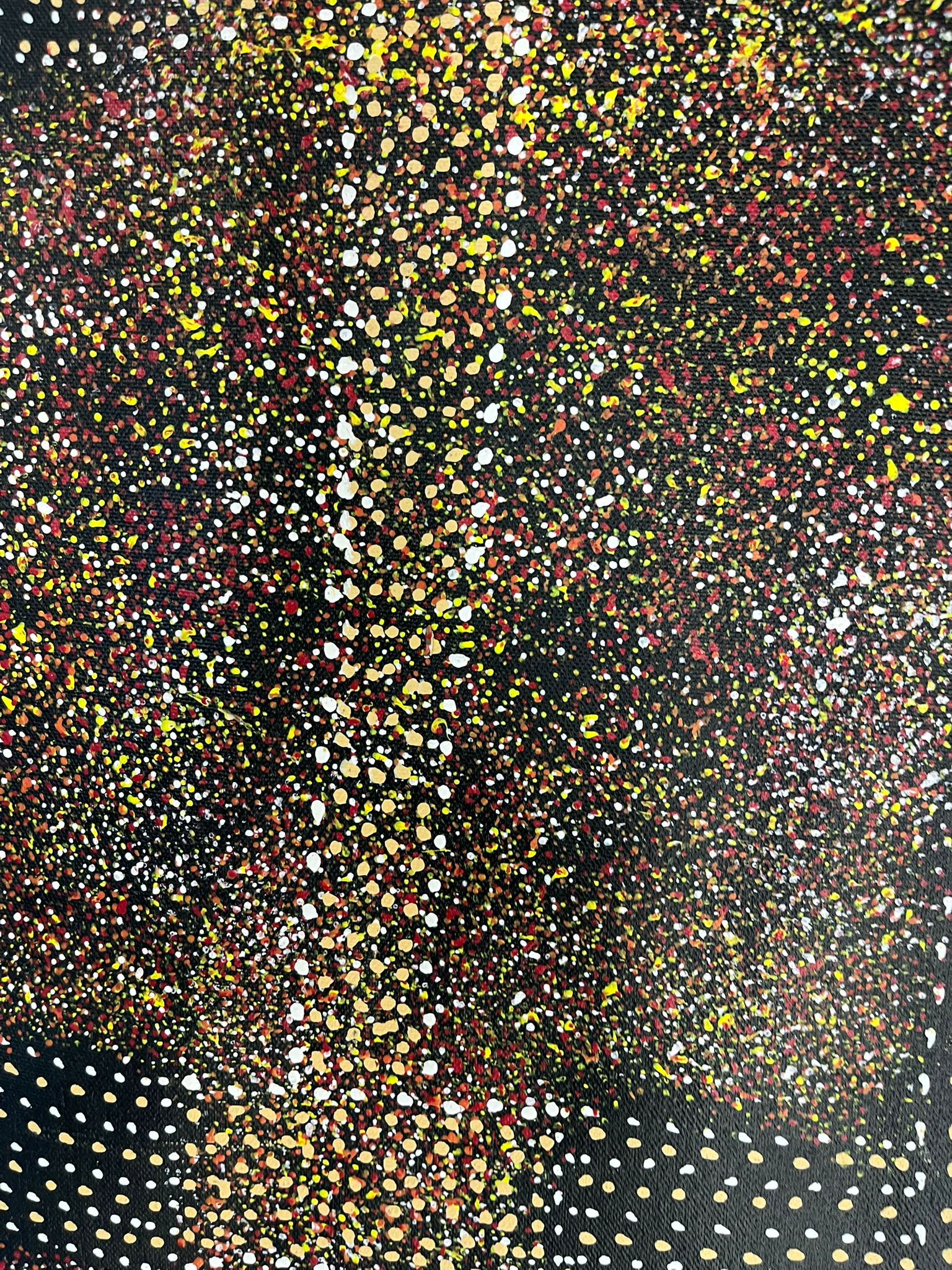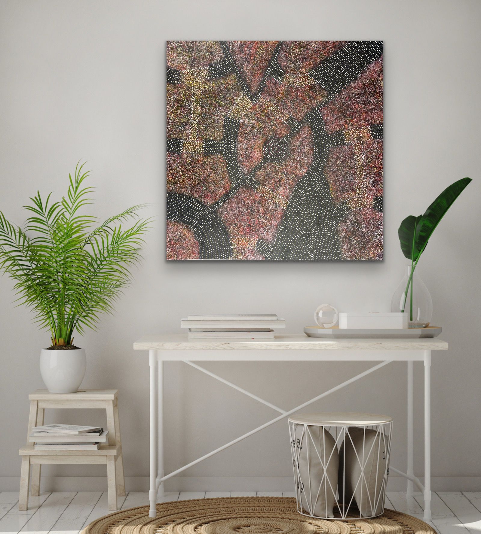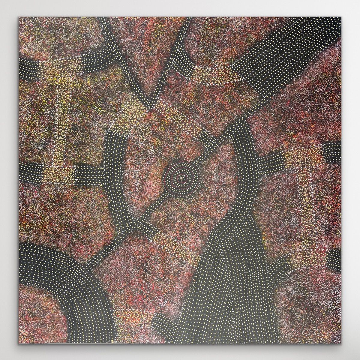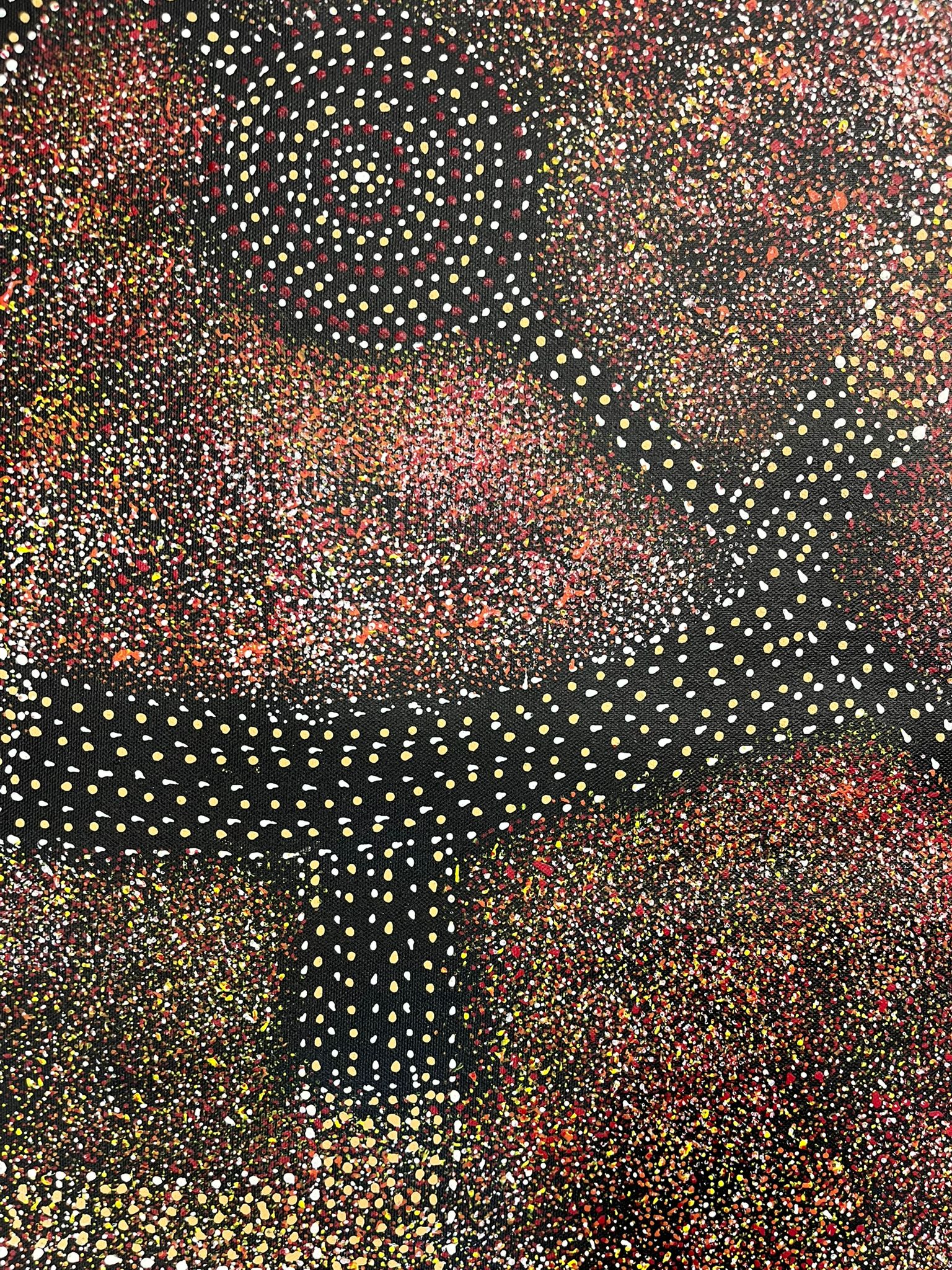 The paintings depict women journeying to gather Bush Plums. The dotted paths trace the routes they travel, while the smaller dotted sections represent areas where the bush plums grow. The larger, more colourful sections along the paths symbolise the matured flowers. At the centre, the circle signifies the meeting place where the women come together at the end of their journey to share and enjoy the food they have collected.