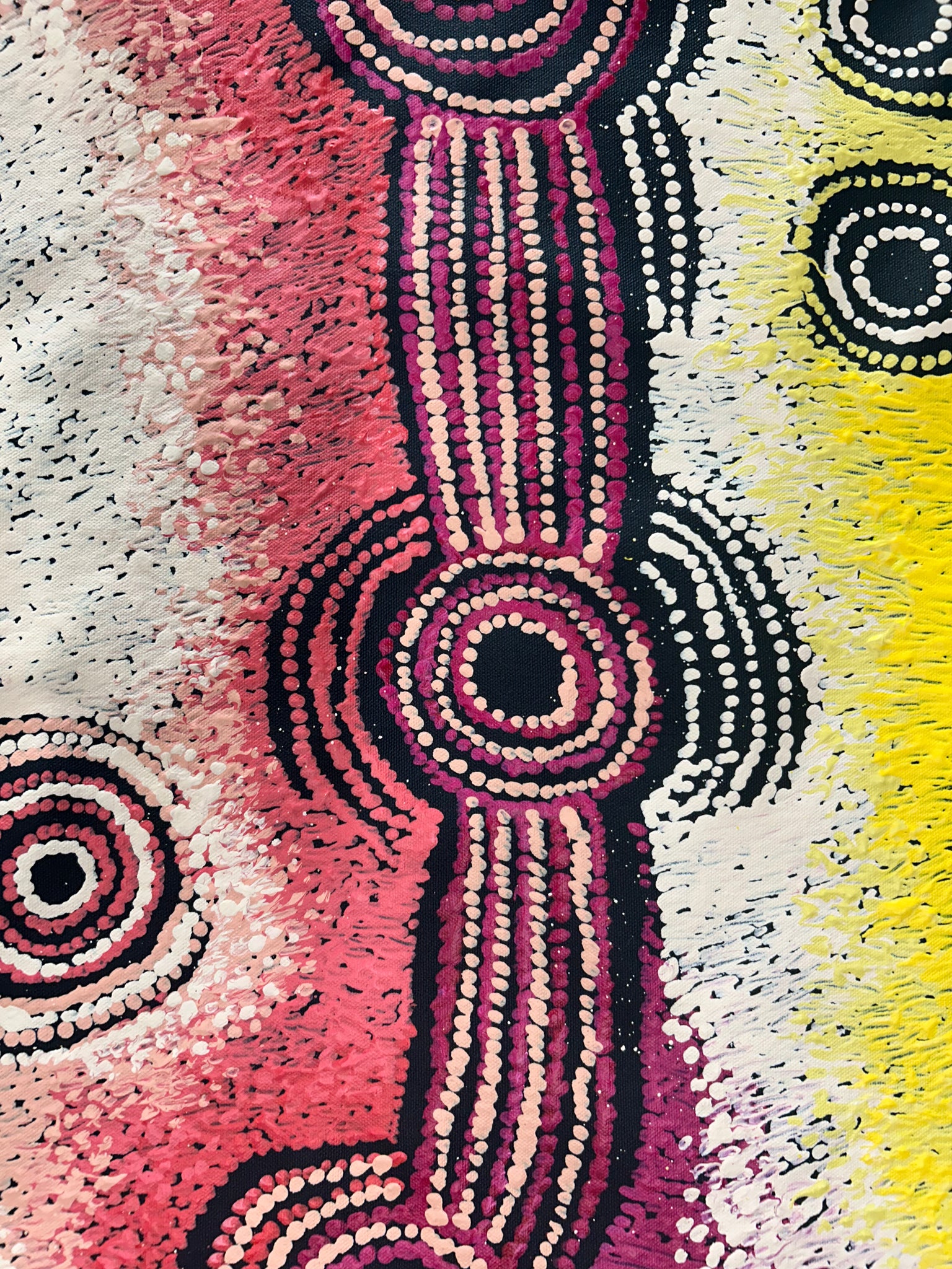 Rooted in Dreamtime traditions, her dot paintings merge Anangu heritage with contemporary design, continuing the family legacy of Jimmy Baker and Kay Baker within the Western Desert art movement.