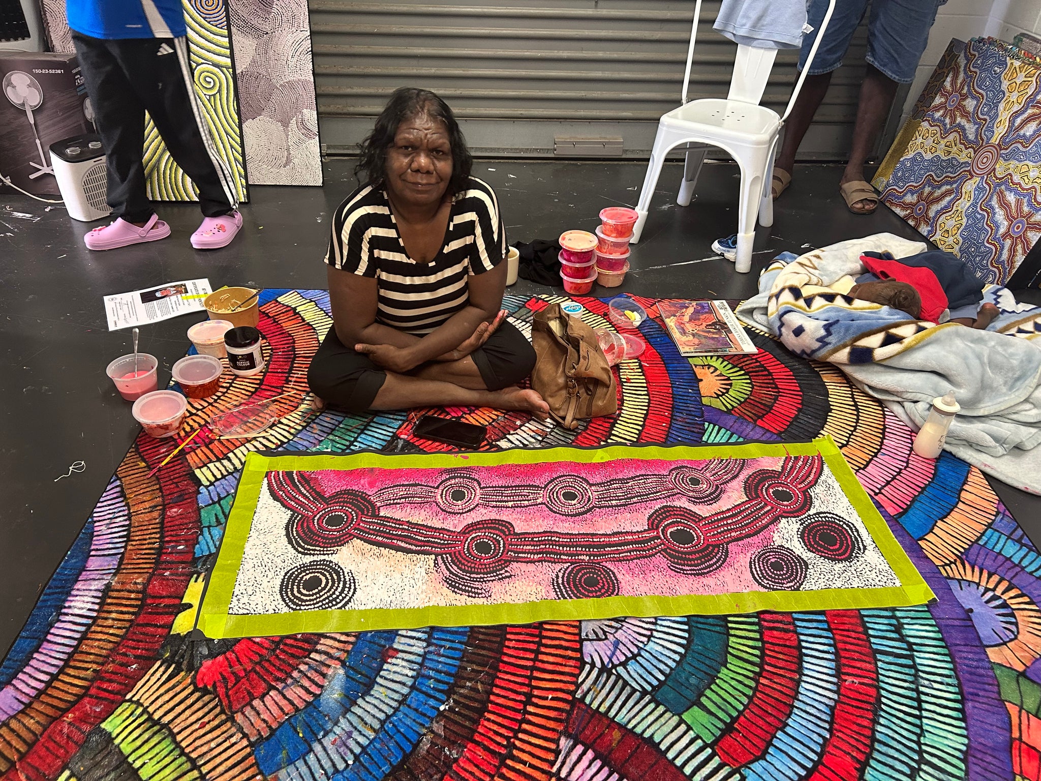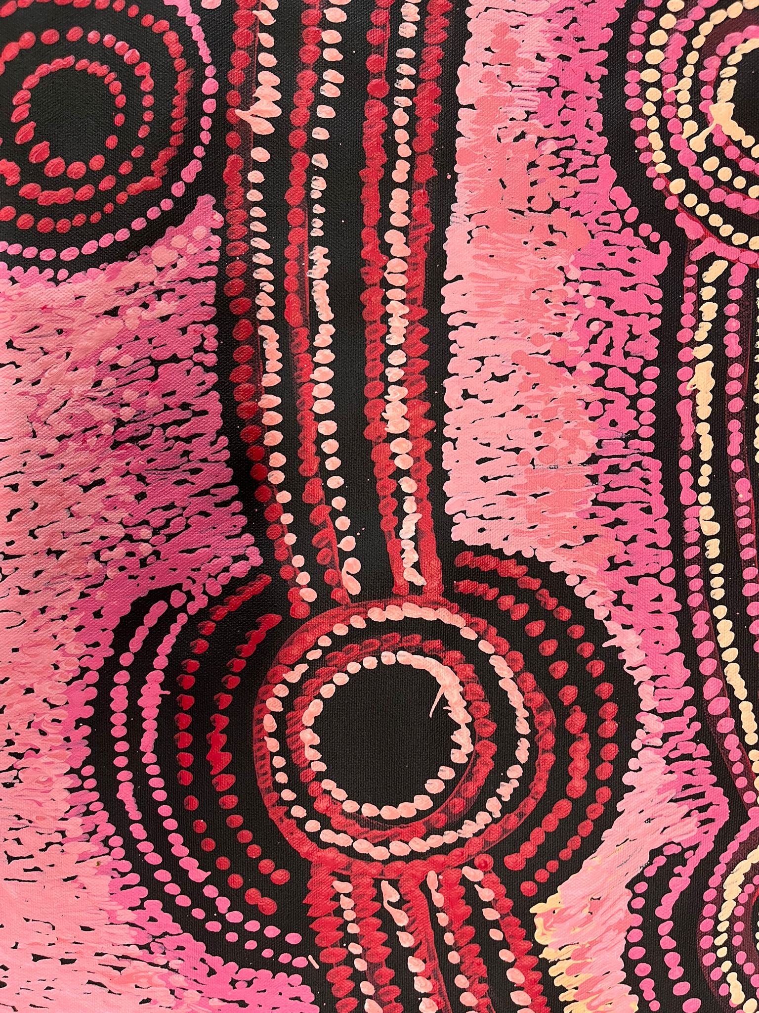 Rooted in Dreamtime traditions, her dot paintings merge Anangu heritage with contemporary design, continuing the family legacy of Jimmy Baker and Kay Baker within the Western Desert art movement.