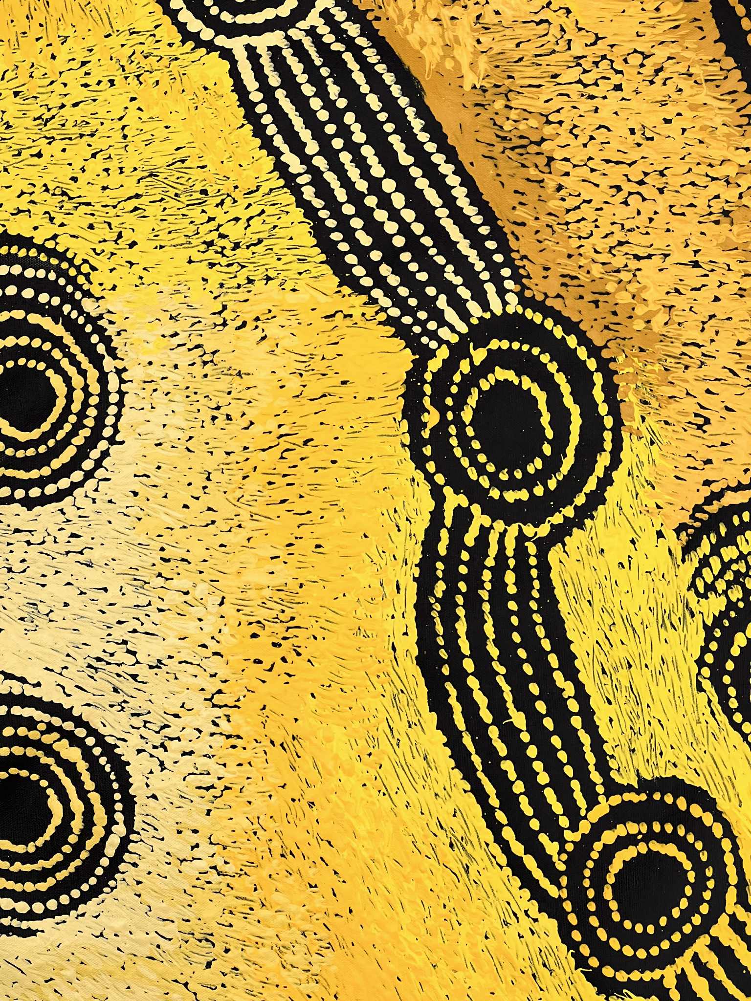 Rooted in Dreamtime traditions, her dot paintings merge Anangu heritage with contemporary design, continuing the family legacy of Jimmy Baker and Kay Baker within the Western Desert art movement.