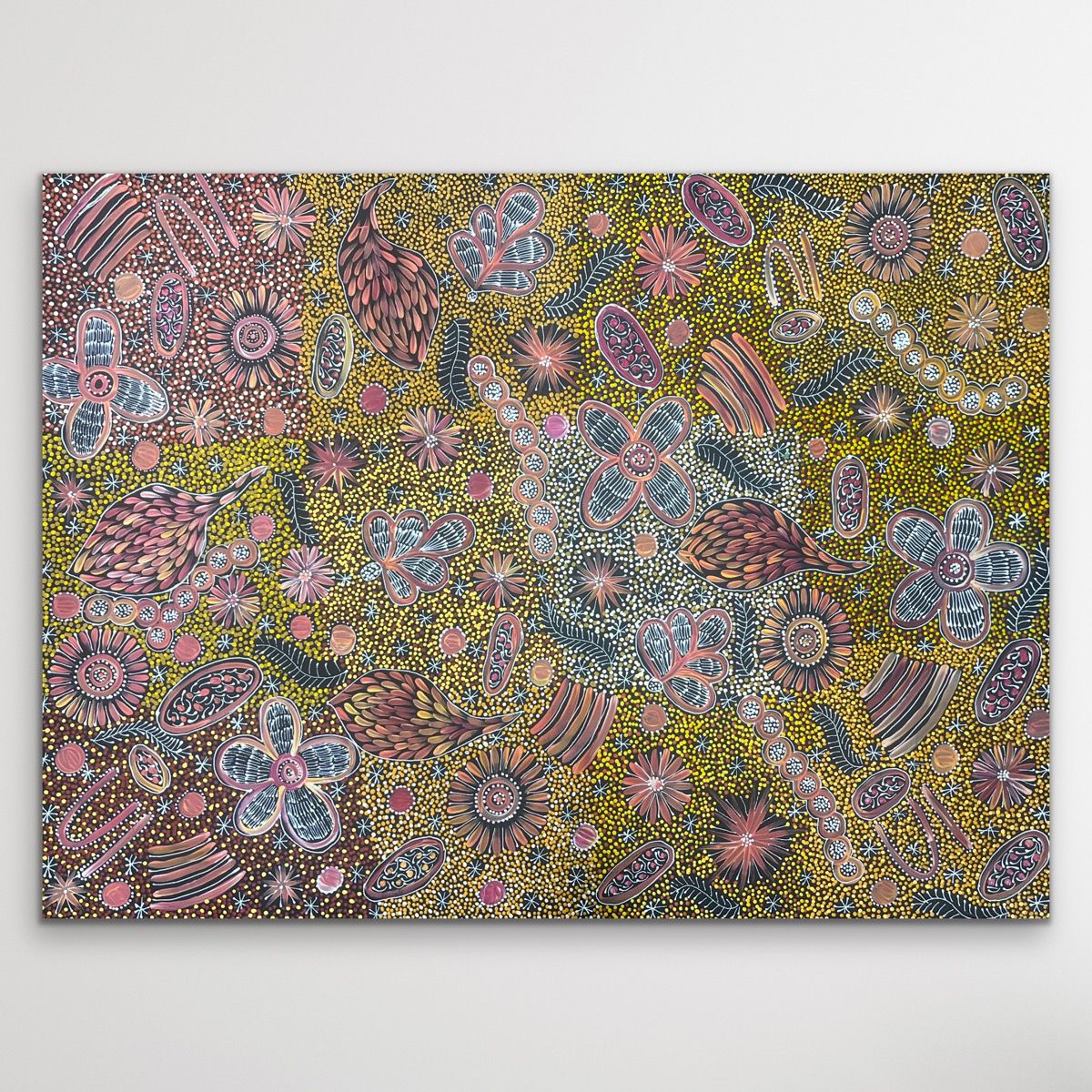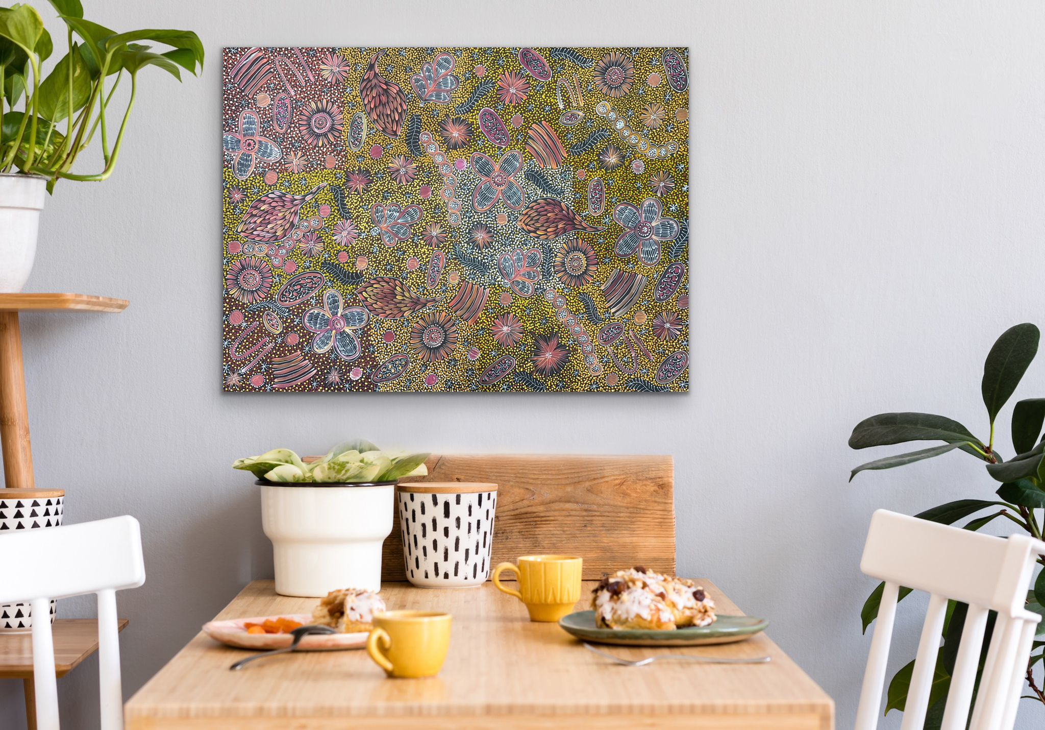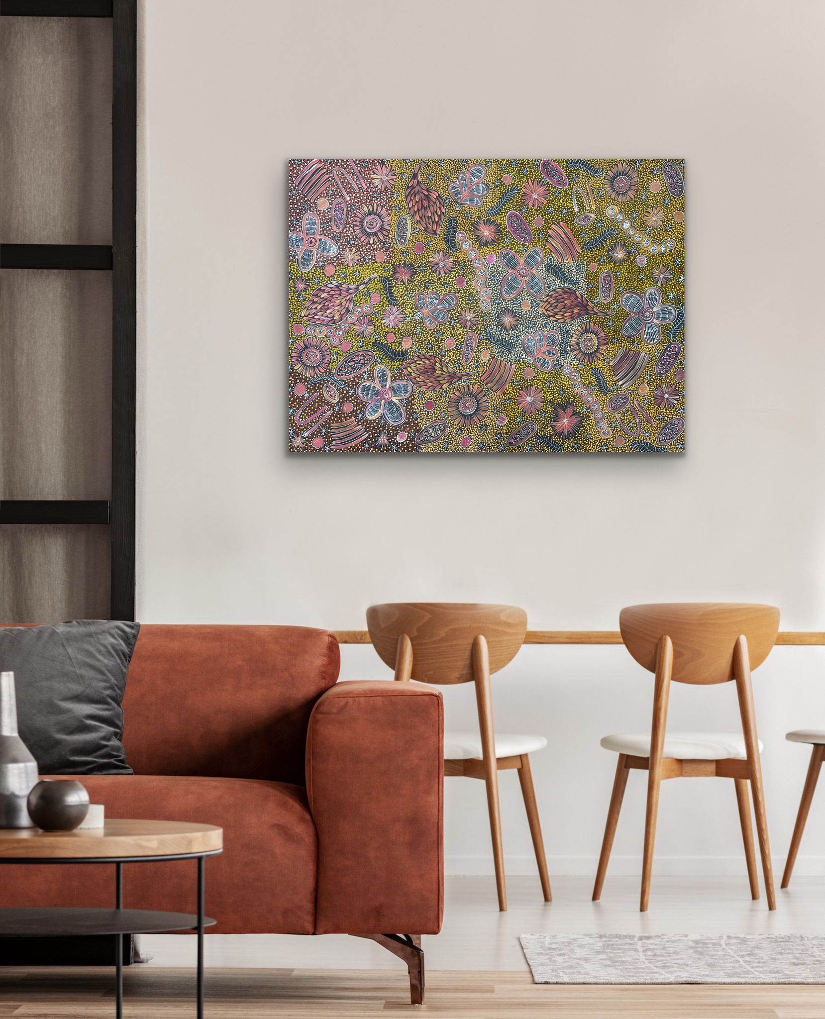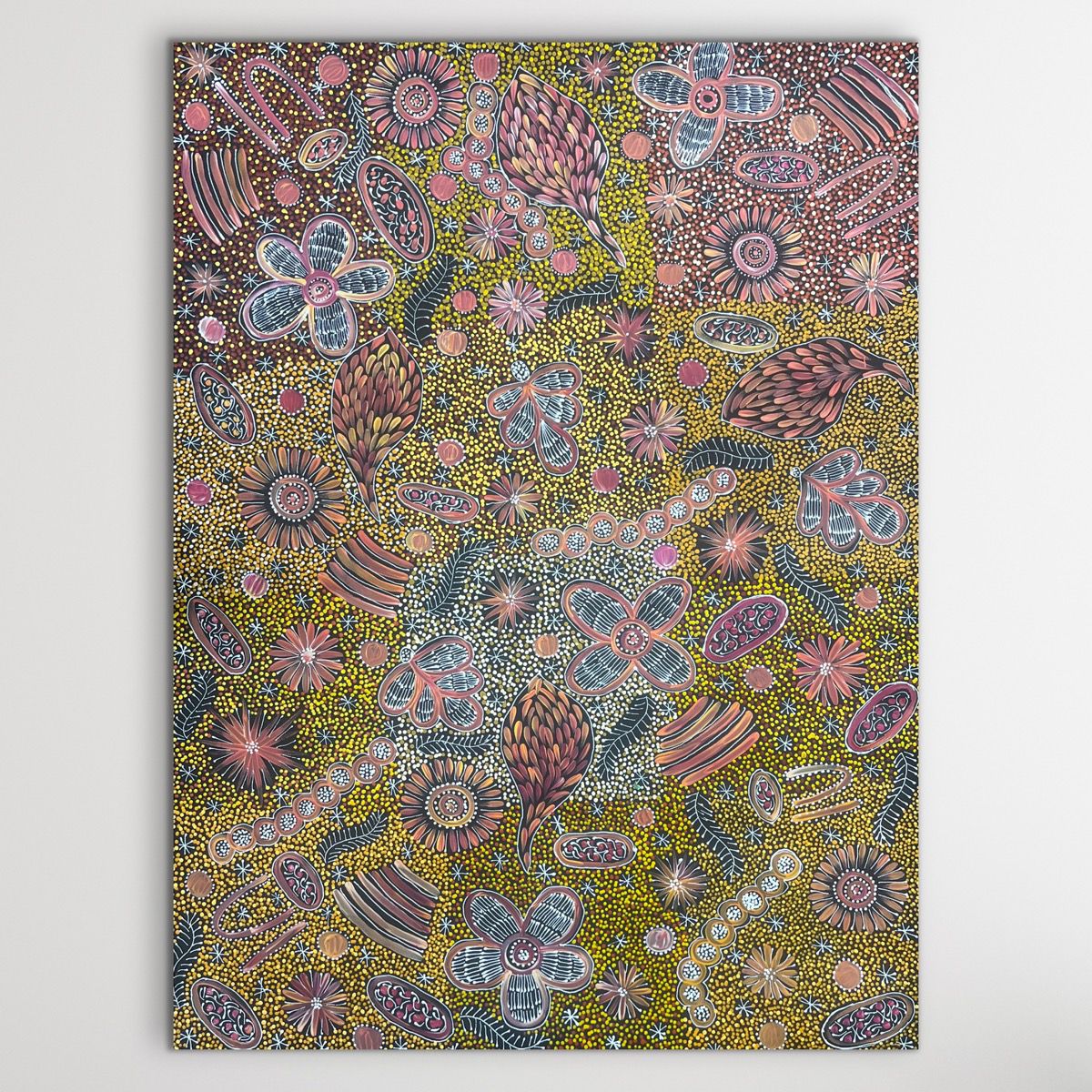 "My Country" by Belinda Golder Kngwarreye is an evocative piece that celebrates the artist's deep connection to her ancestral land. The intricate dot work and use of colours reflect her heritage, telling stories passed down through generations.
