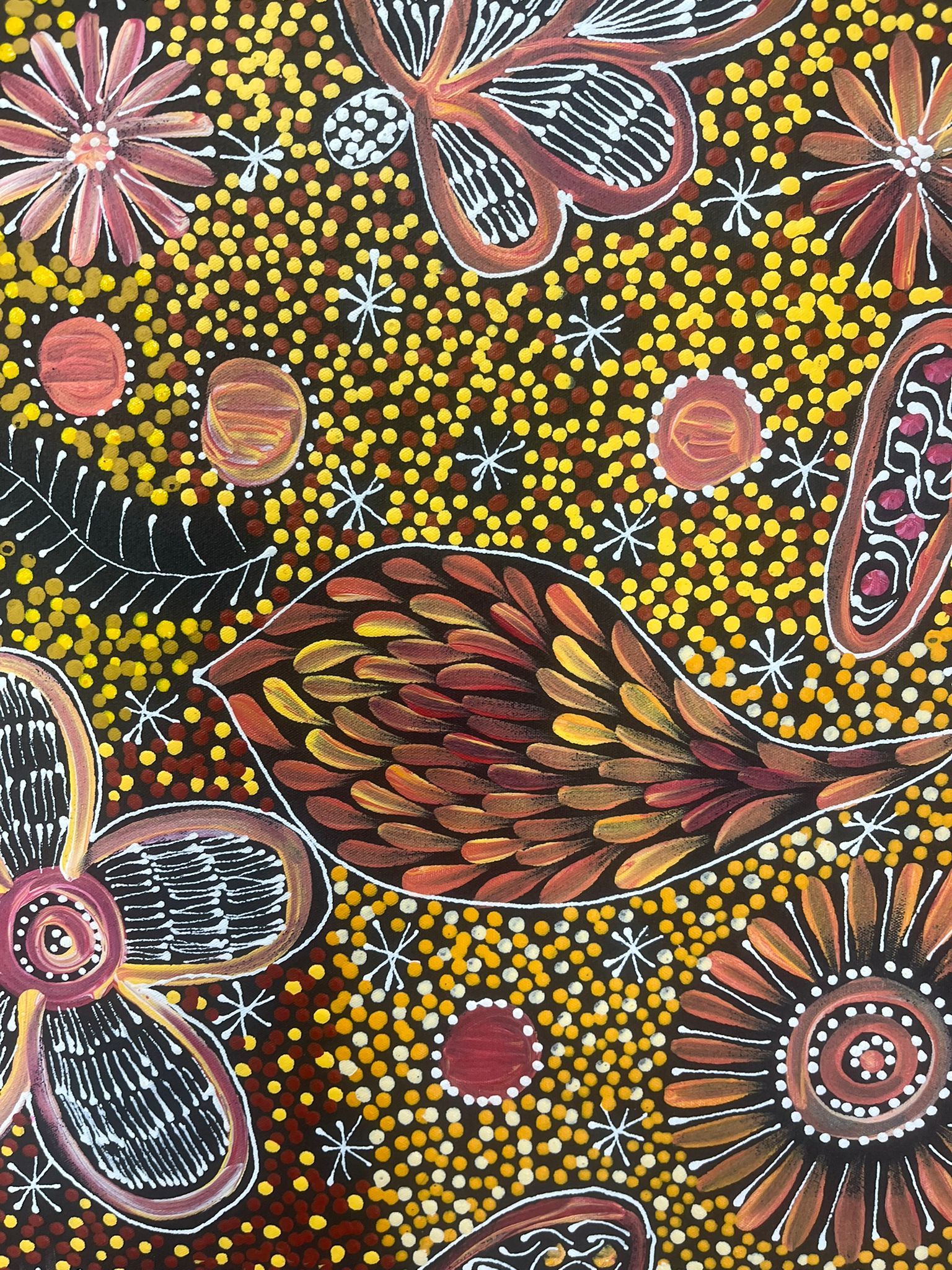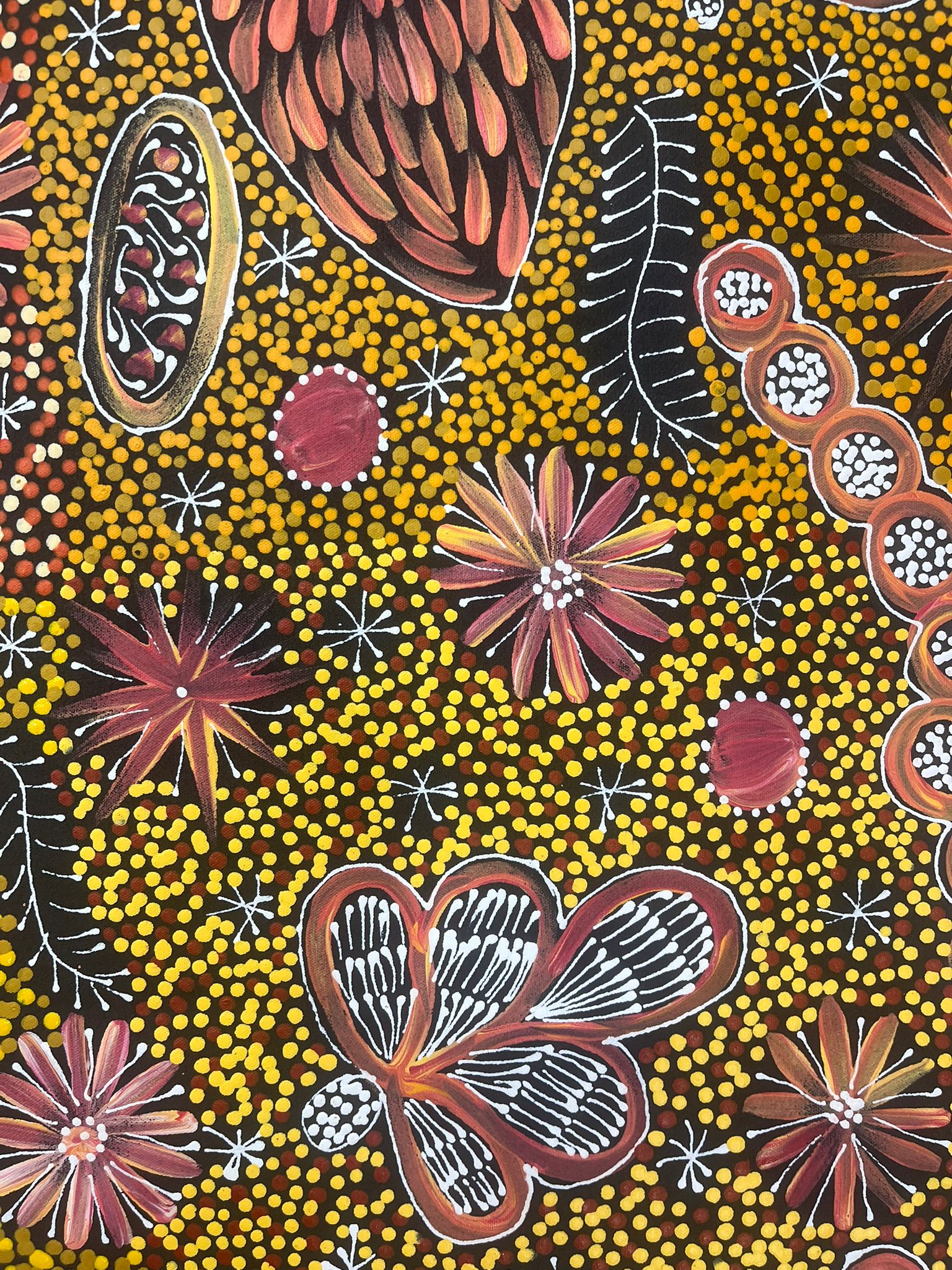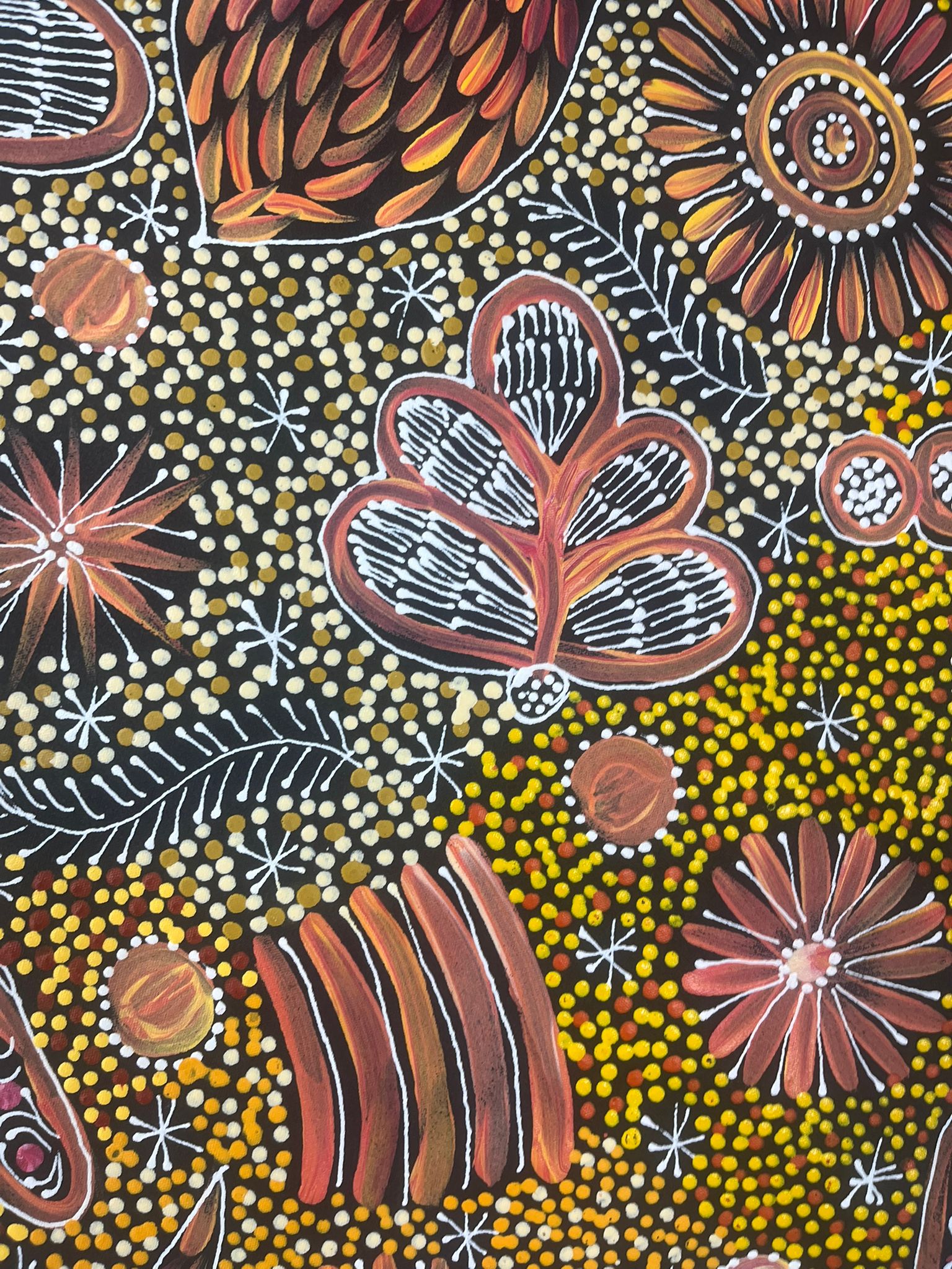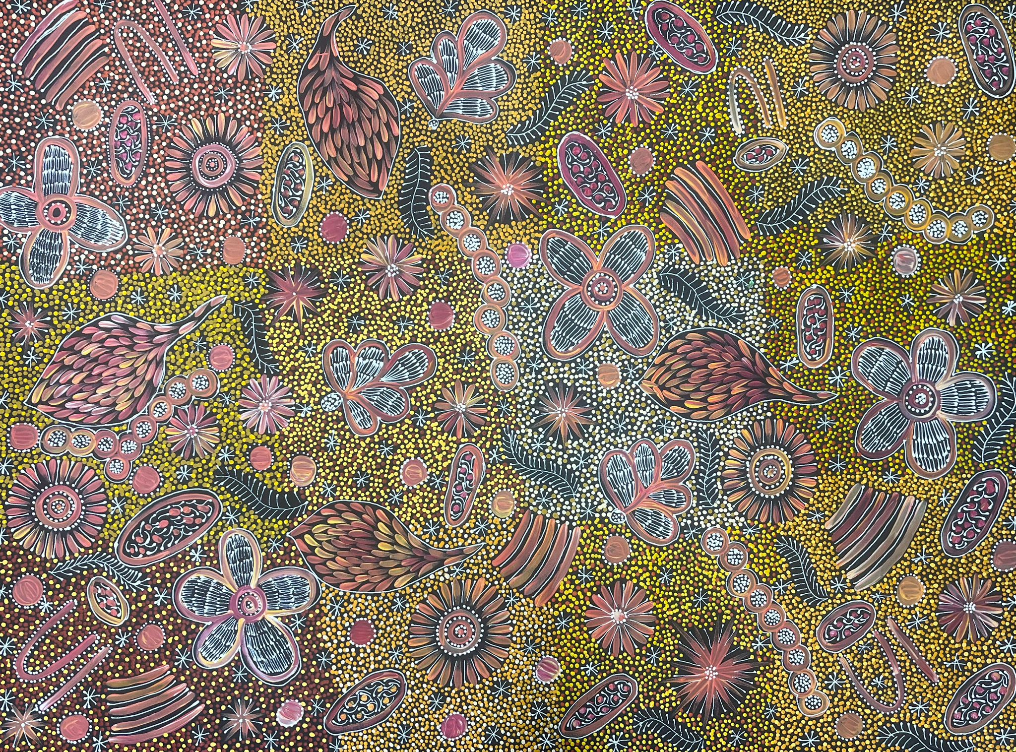 "My Country" by Belinda Golder Kngwarreye is an evocative piece that celebrates the artist's deep connection to her ancestral land. The intricate dot work and use of colours reflect her heritage, telling stories passed down through generations.