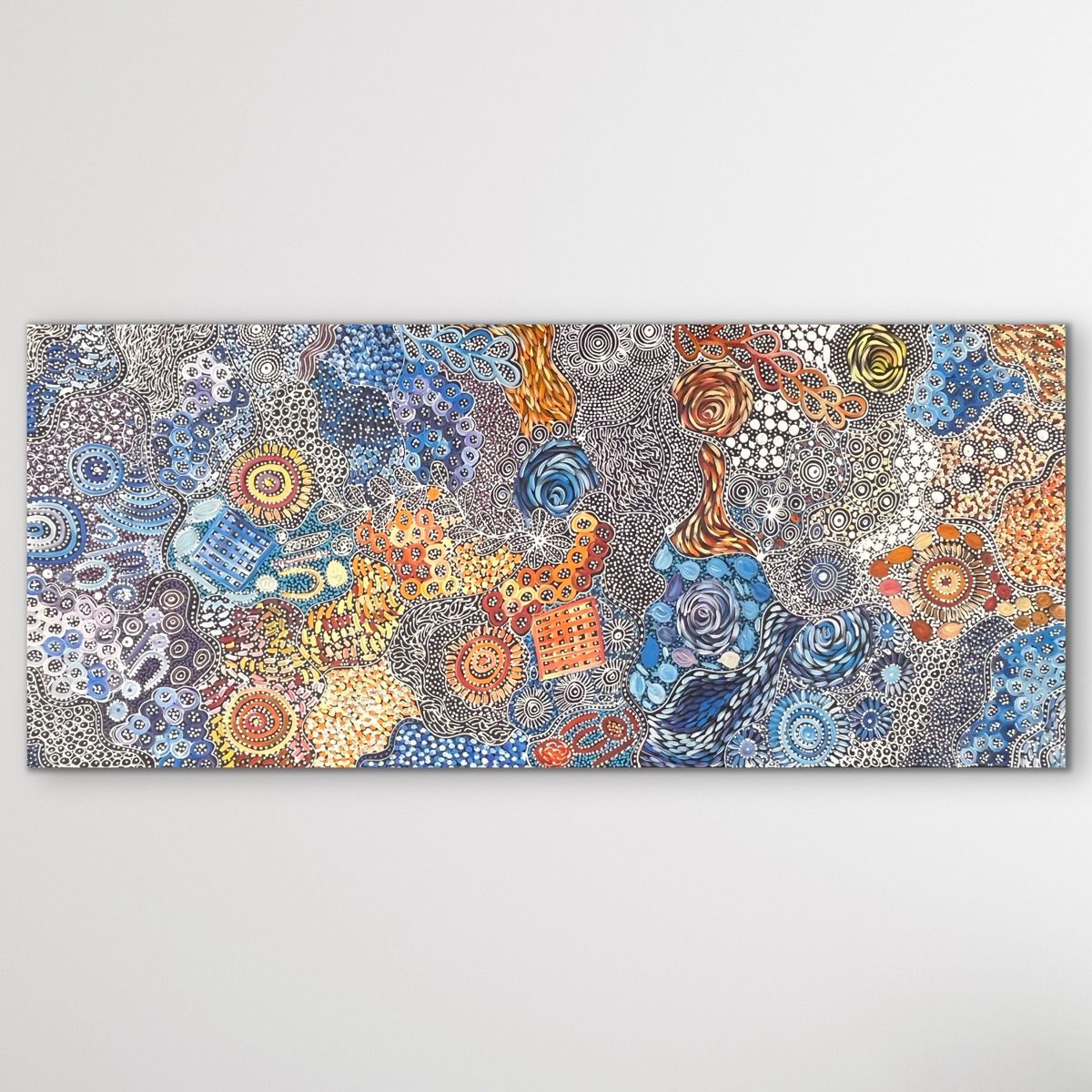 "My Country (Utopia)" Janet Golder Kngwarreye 201cm x 88cm original indigenous painting on white wall large orange blue white yellow