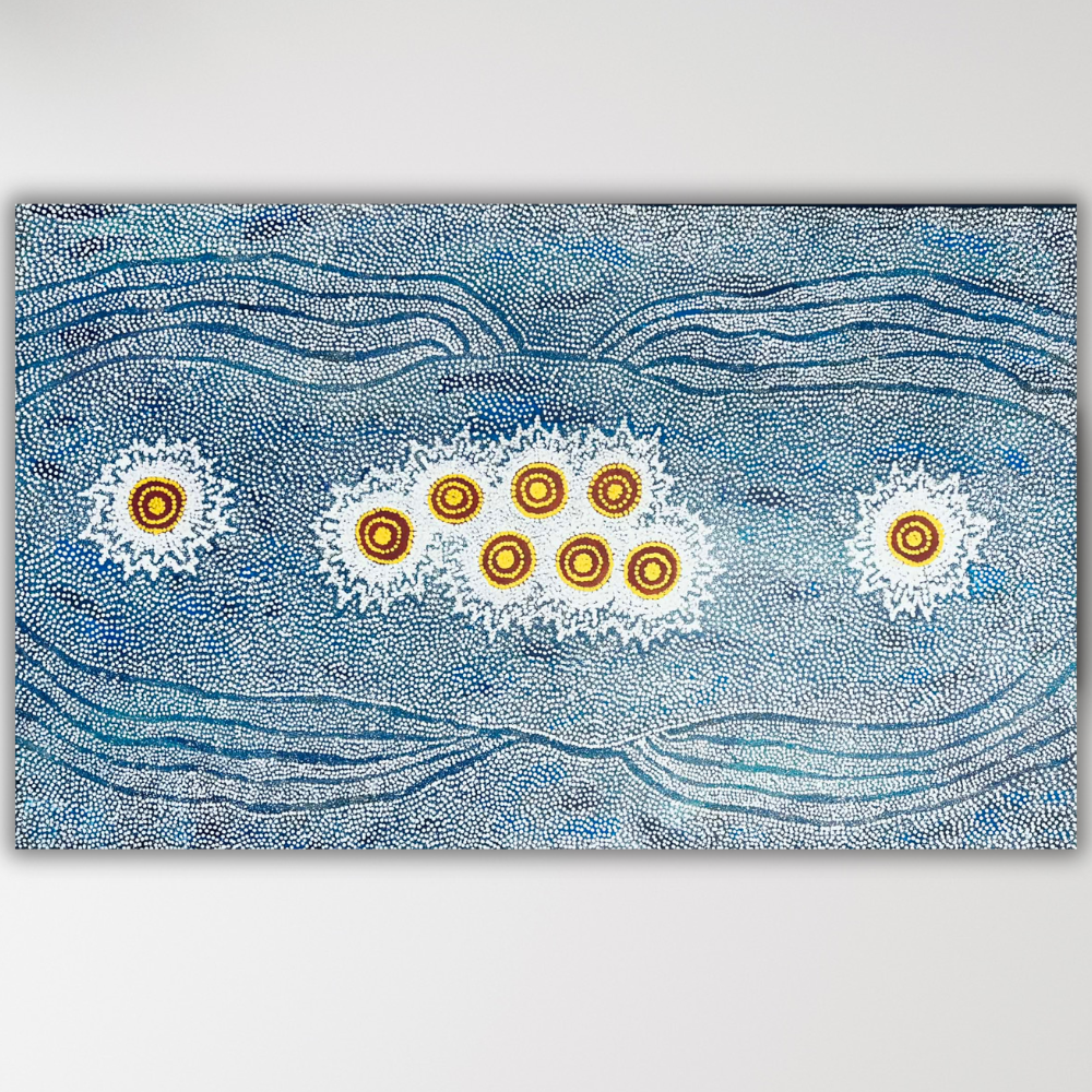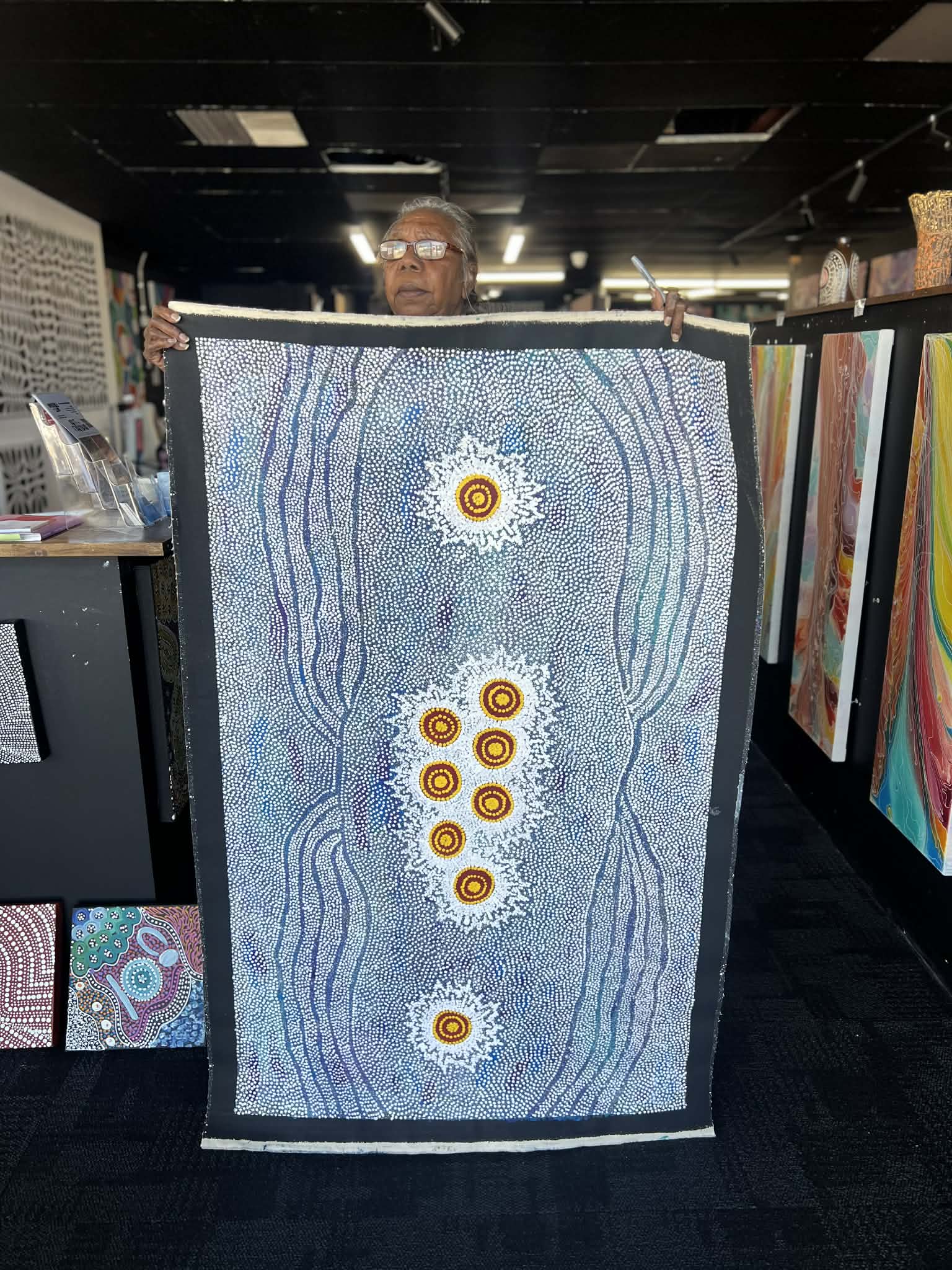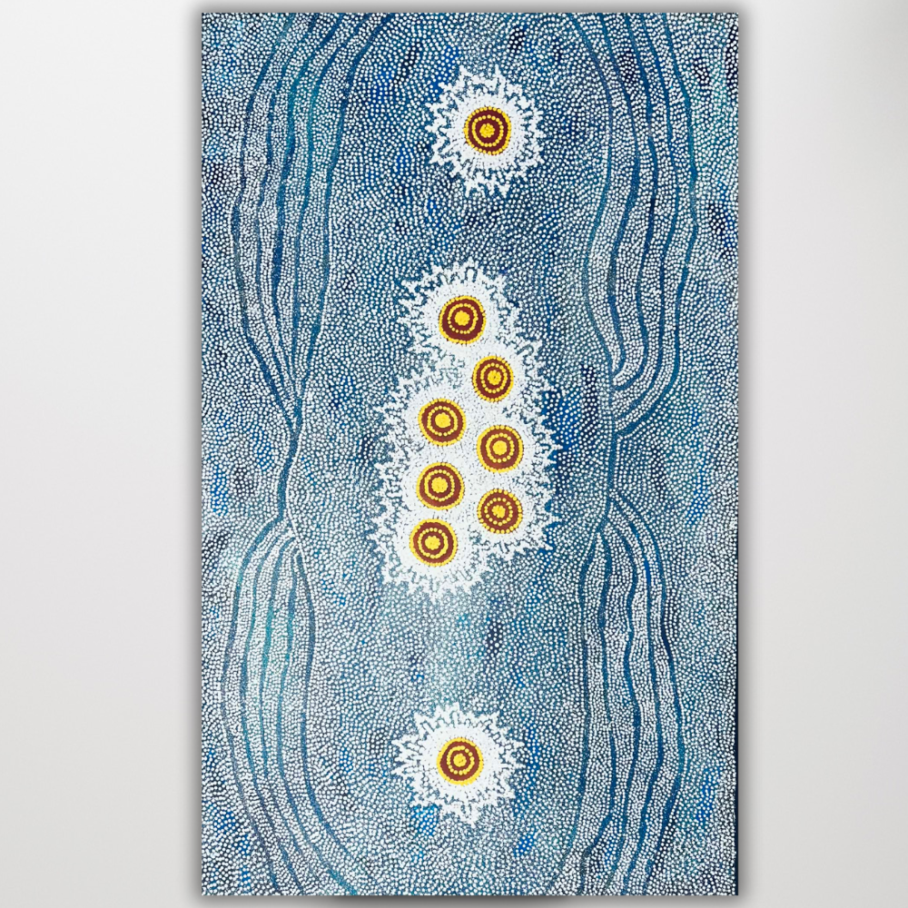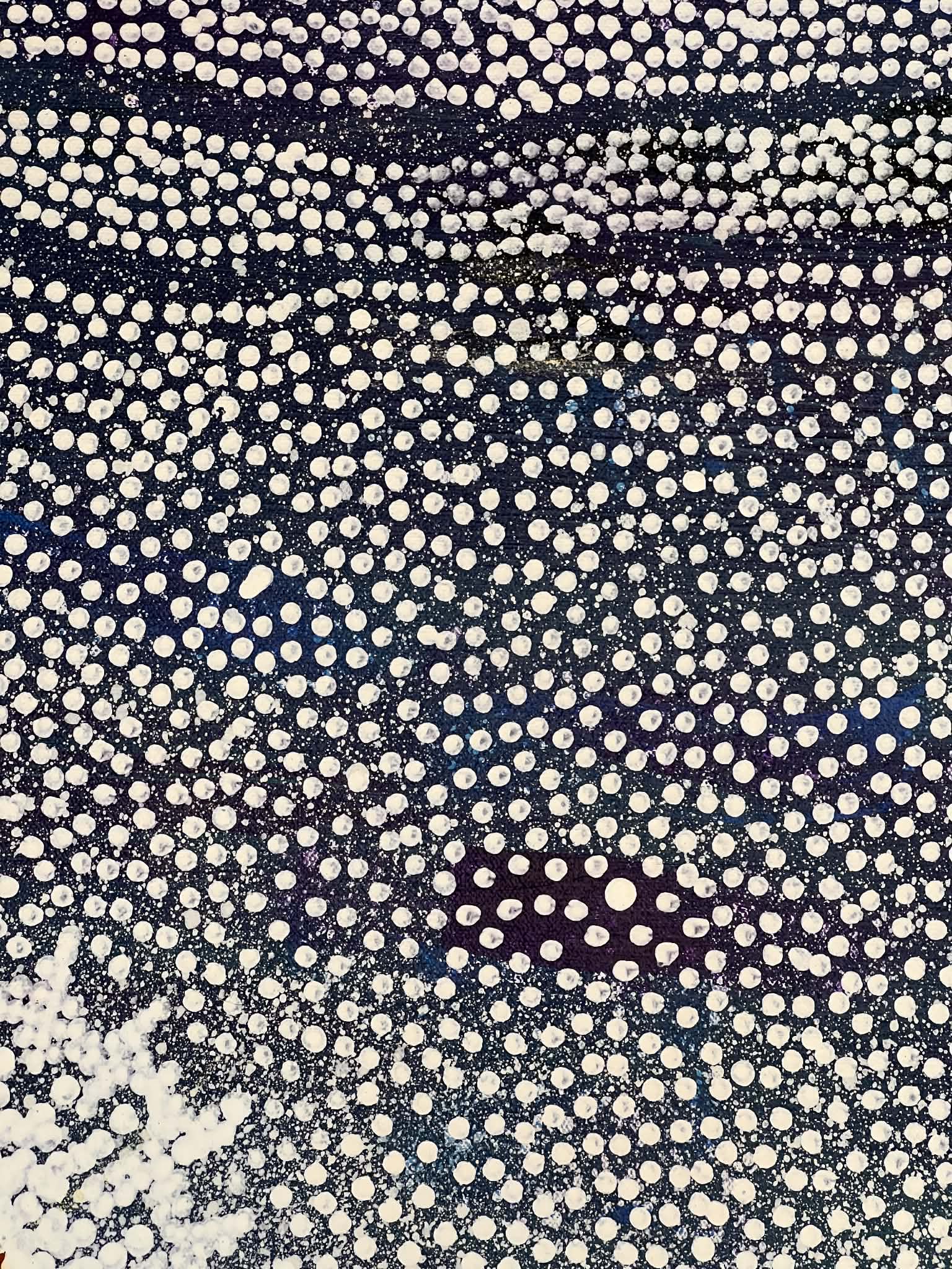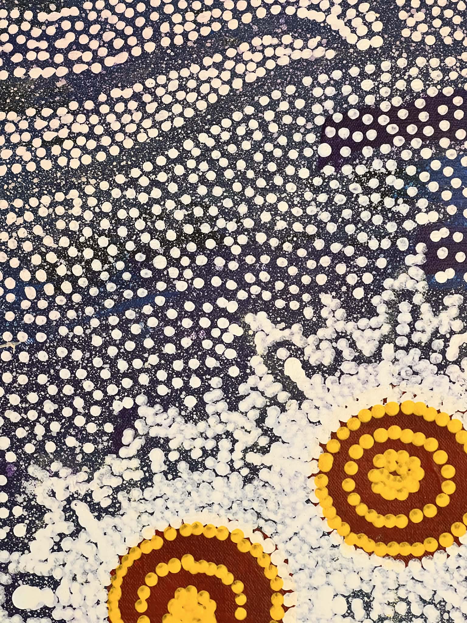 Maureen “Seven Sisters” illustrates a cluster of stars visible in the night sky, also known as the Pleiades. This constellation tells the story of the Seven Sisters, who are pursued by a male lover while their father seeks to protect them. In Maureen’s paintings, the father is depicted at one end of the painting, with the male at the other.