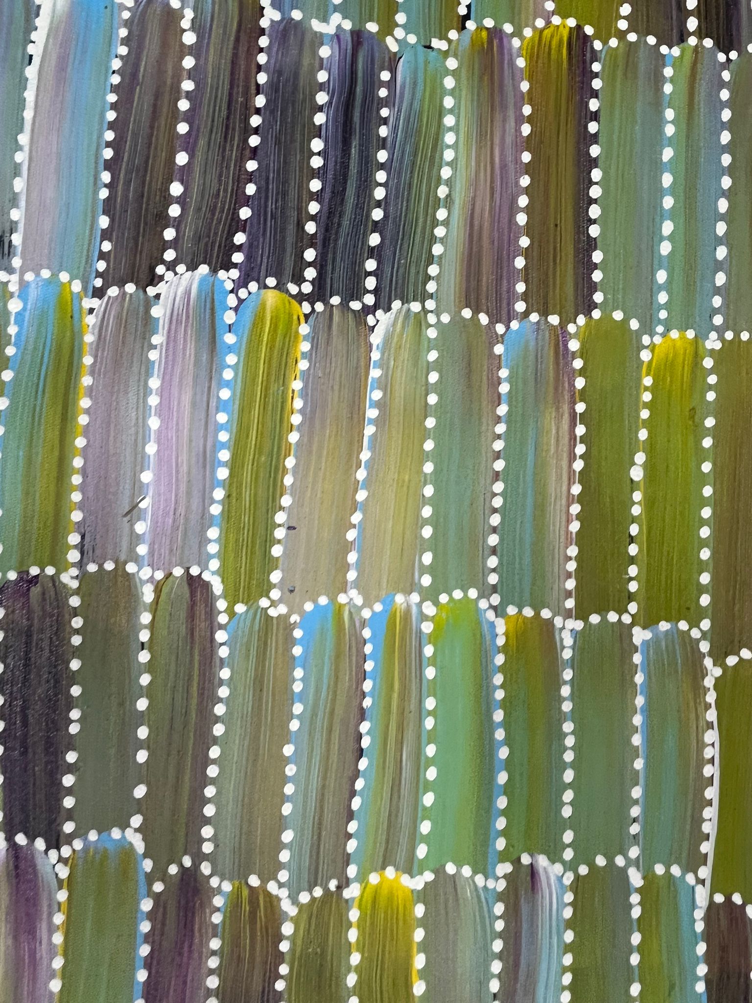 Jeannies palette is bright and bold and each piece has a slightly different range on the canvas. Each stroke may contain two or three colours which are painted precisely which comes together to create a flowing and eye catching piece to represent Bush yam.