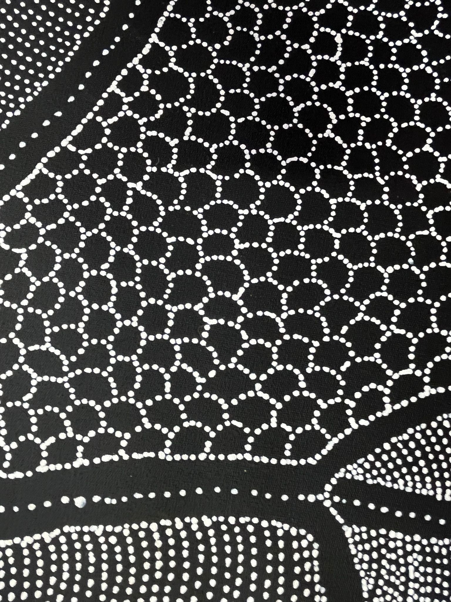 Detailed dot painting by Delvine Pitjara with black and white, cream and yellow