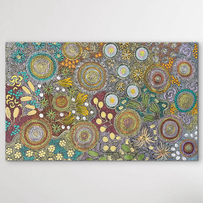 "Budgerigar Dreaming & Bush Tucker" Julieanne Nungurrayi Turner 76cm x 120cm