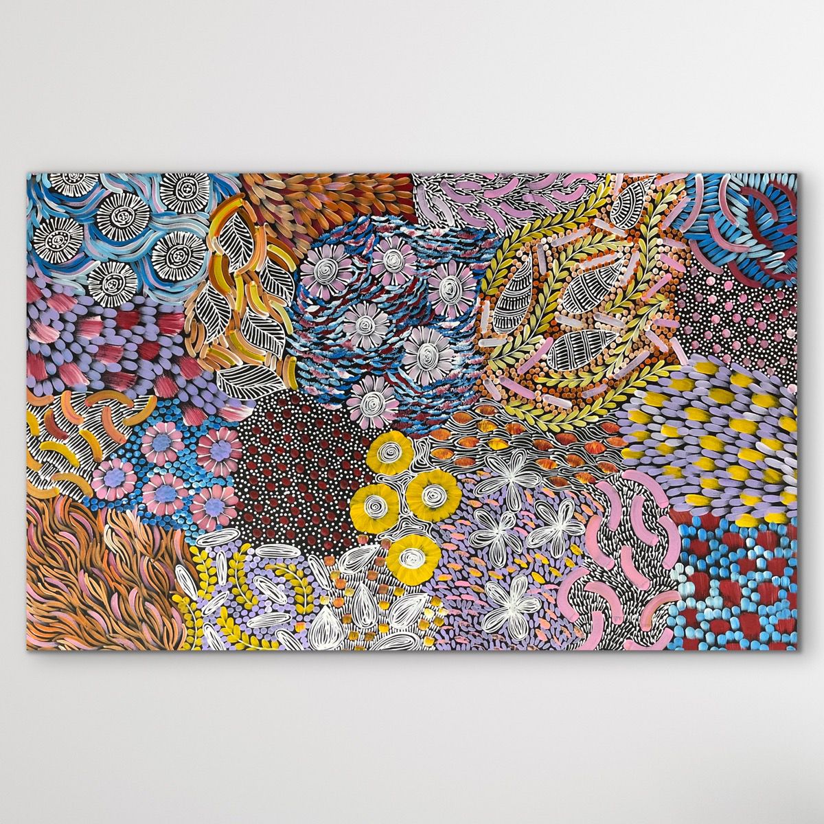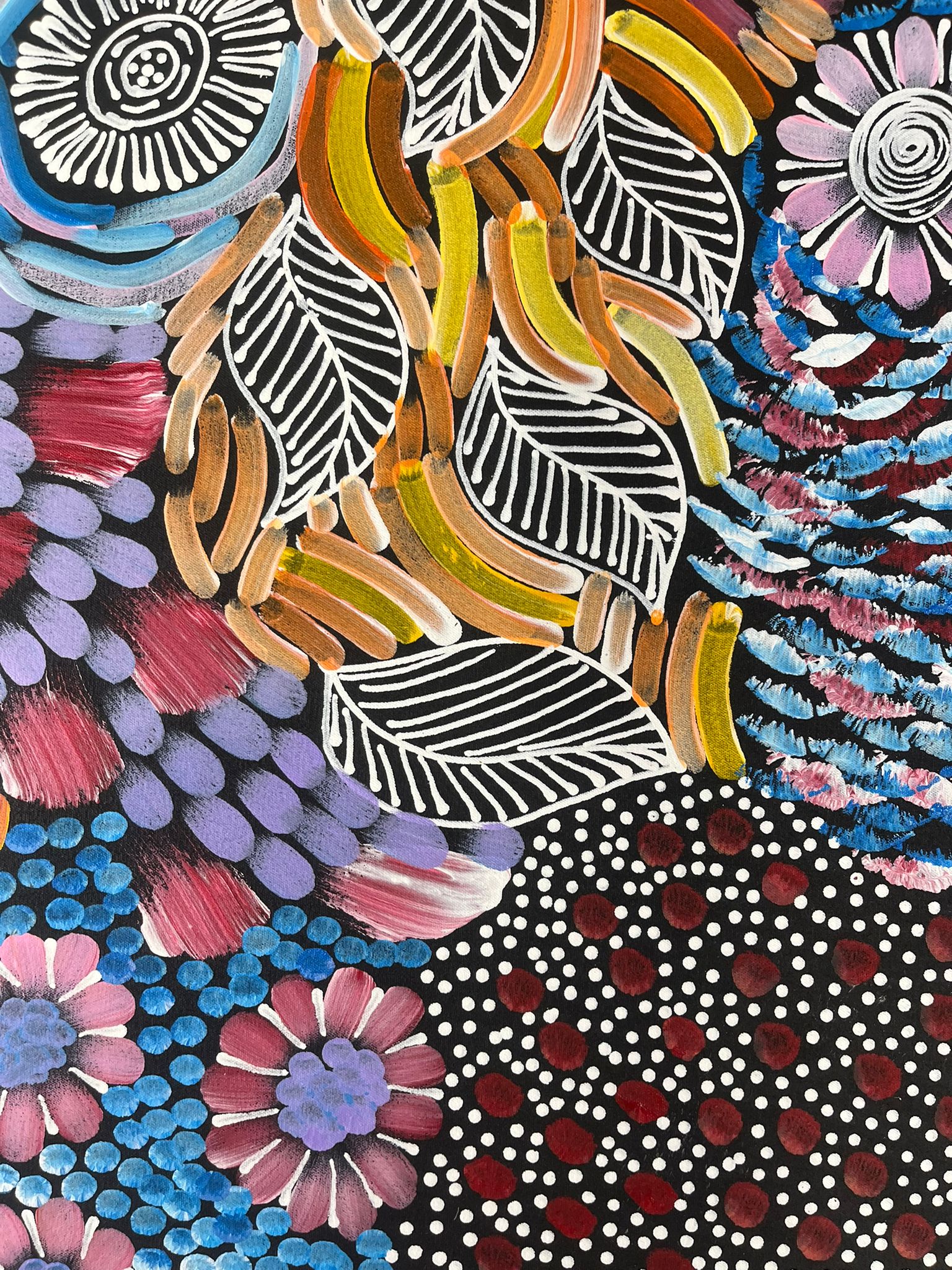 • Load image into Gallery viewer, Colorful Aboriginal bush flower and medicine leaves pattern with flowers and geometric shapes
