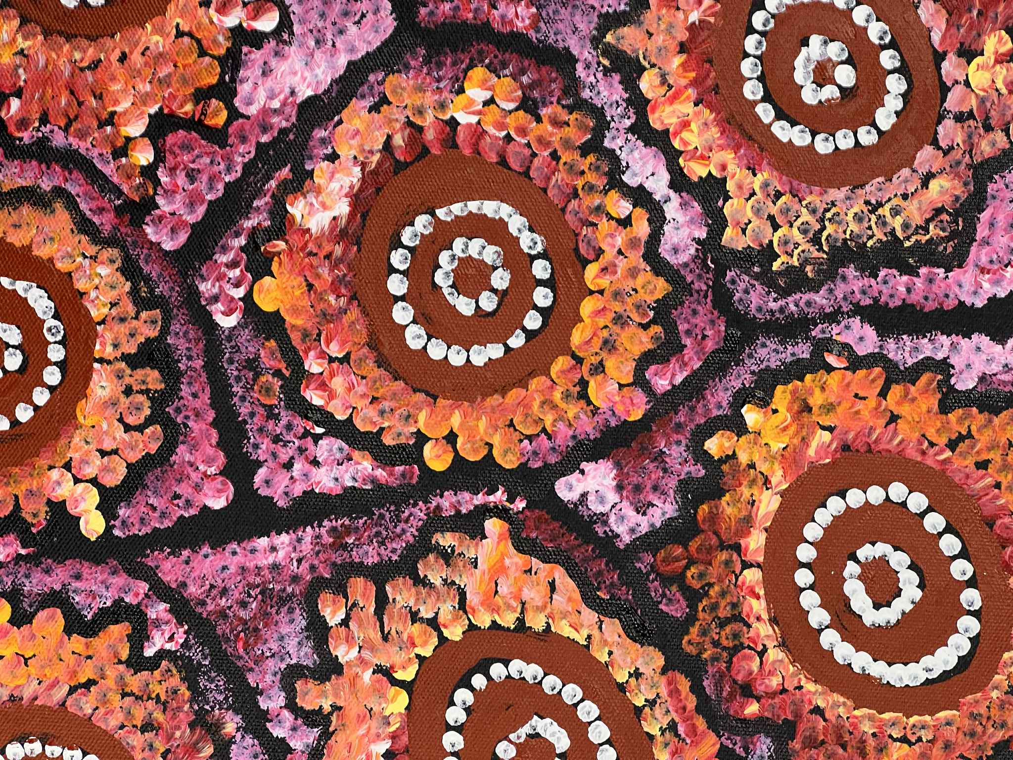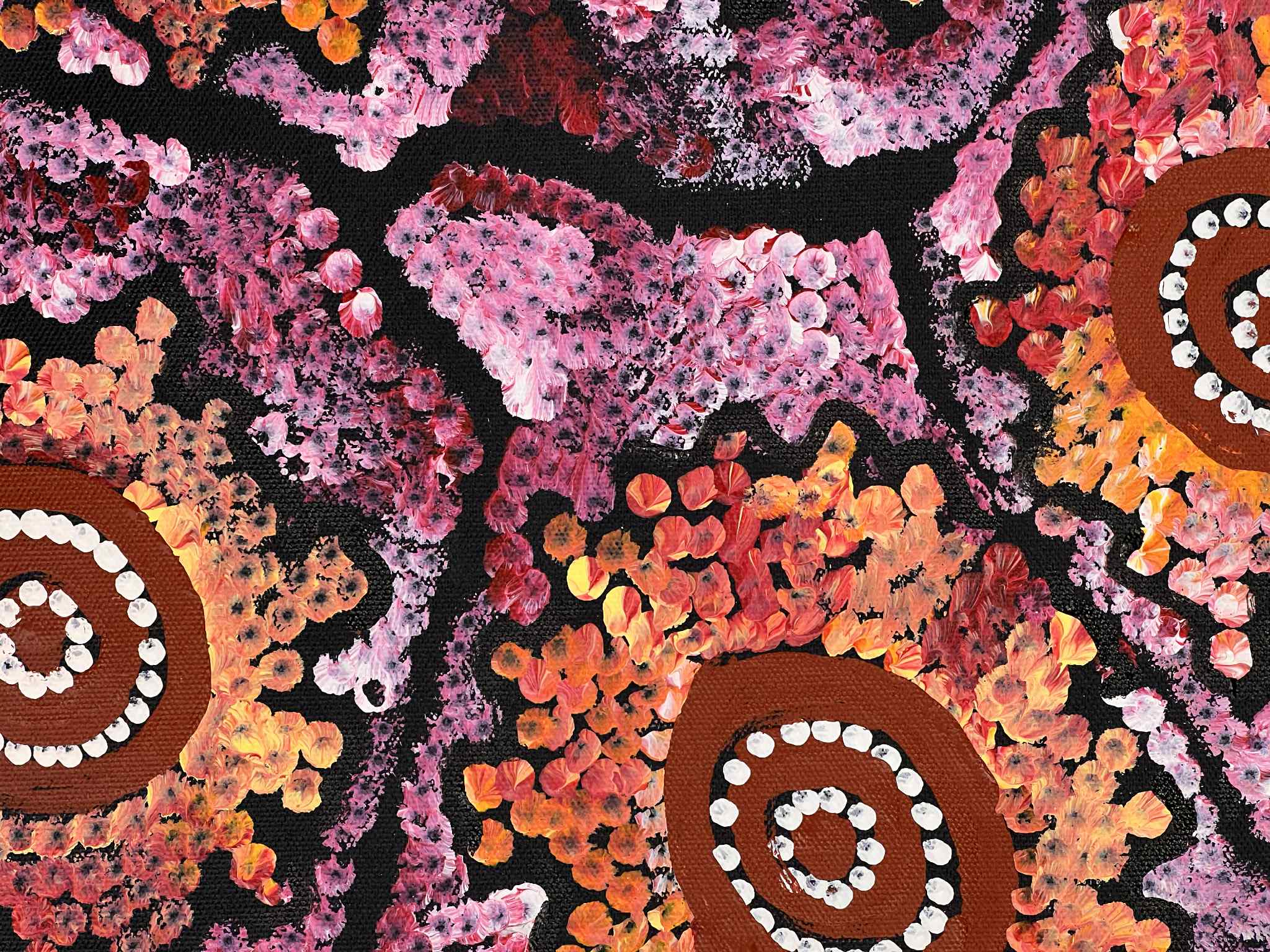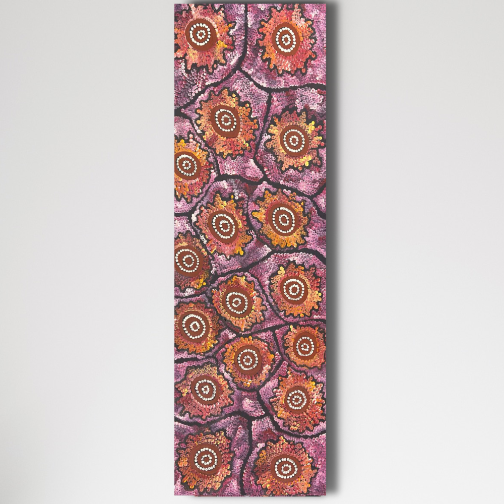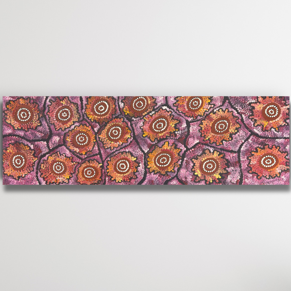 The inspiration behind this artwork stems from the sand dune landscape that defines Maureen's hometown in Yuelamu, situated to the North West of Alice Springs in the Tanami Region. Referred to as Tali in most of the Central Australian Aboriginal language groups, these sand formations are arranged in parallel rows, sculpted by the prevailing winds' direction.