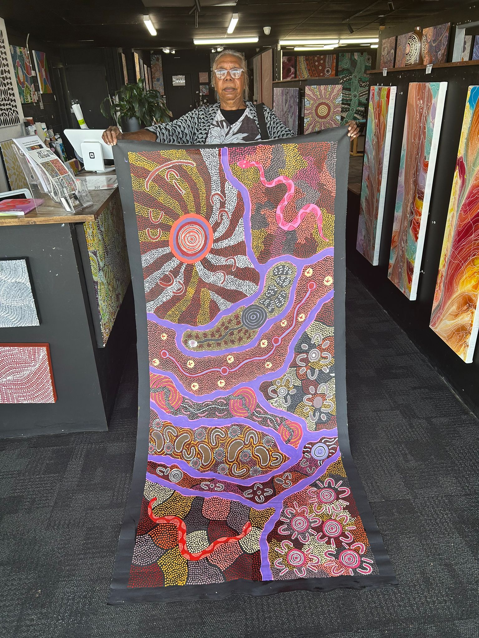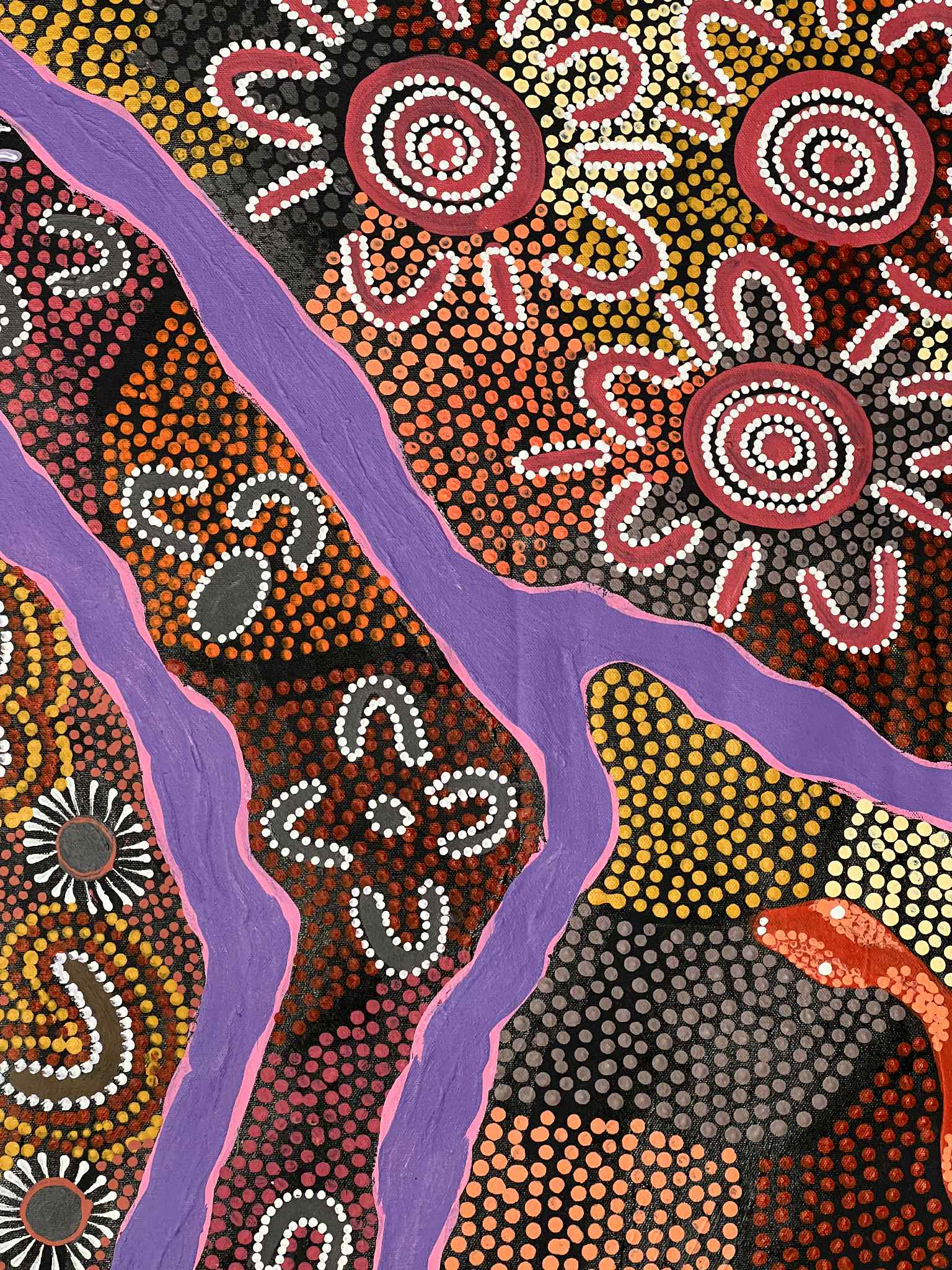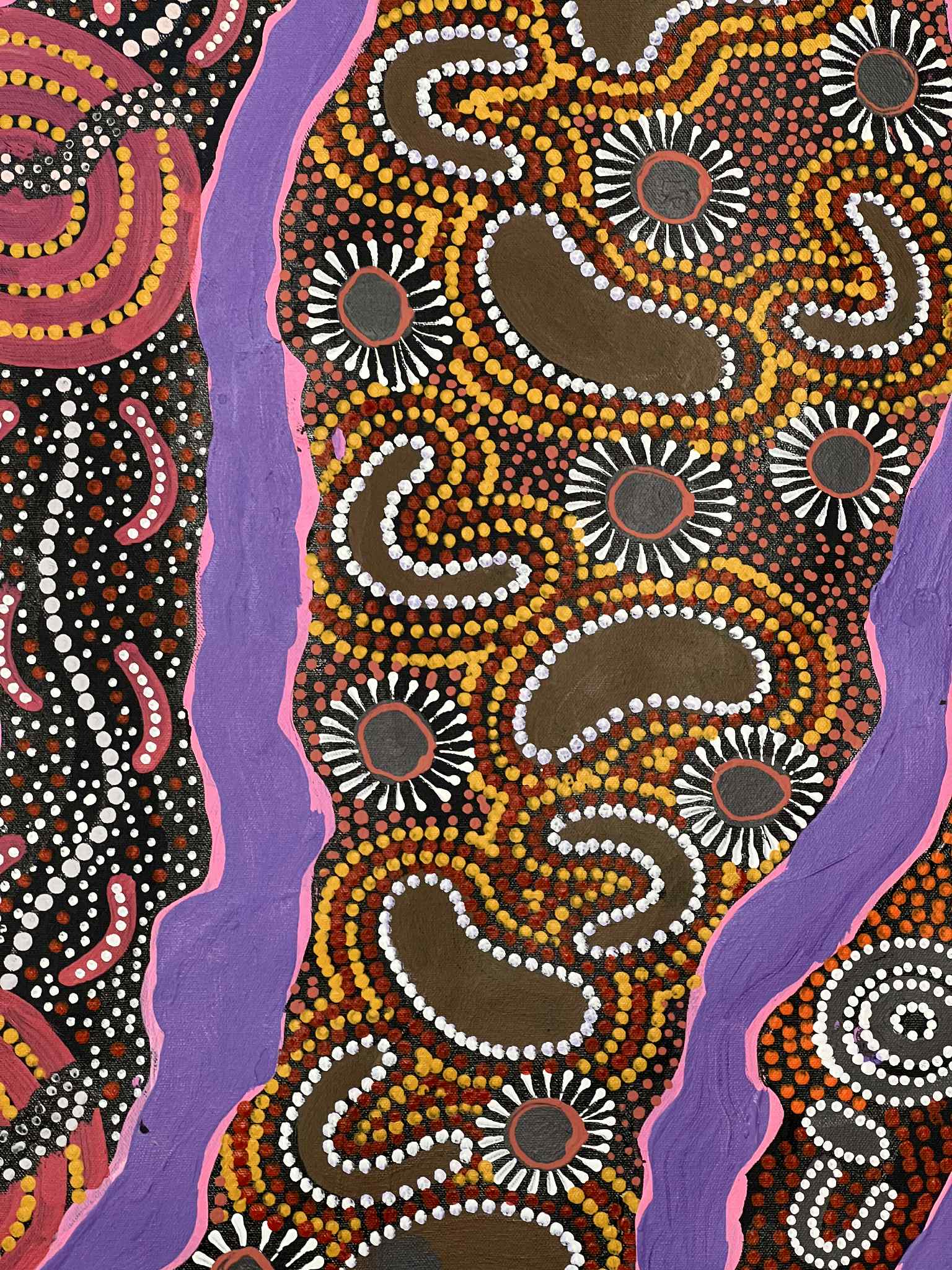 Maureen explained this painting was titled "Fire Dreaming", however would also be called Seven Stories as each section of the painting has its own story. This includes "Snake Dreaming", "Fire Dreaming", "Womens Ceremony", "Women hunting story", "Emu Dreaming", "Women Travelling" and "Bush Tucker".