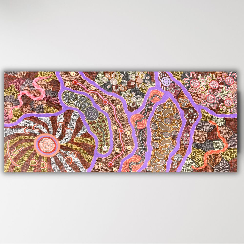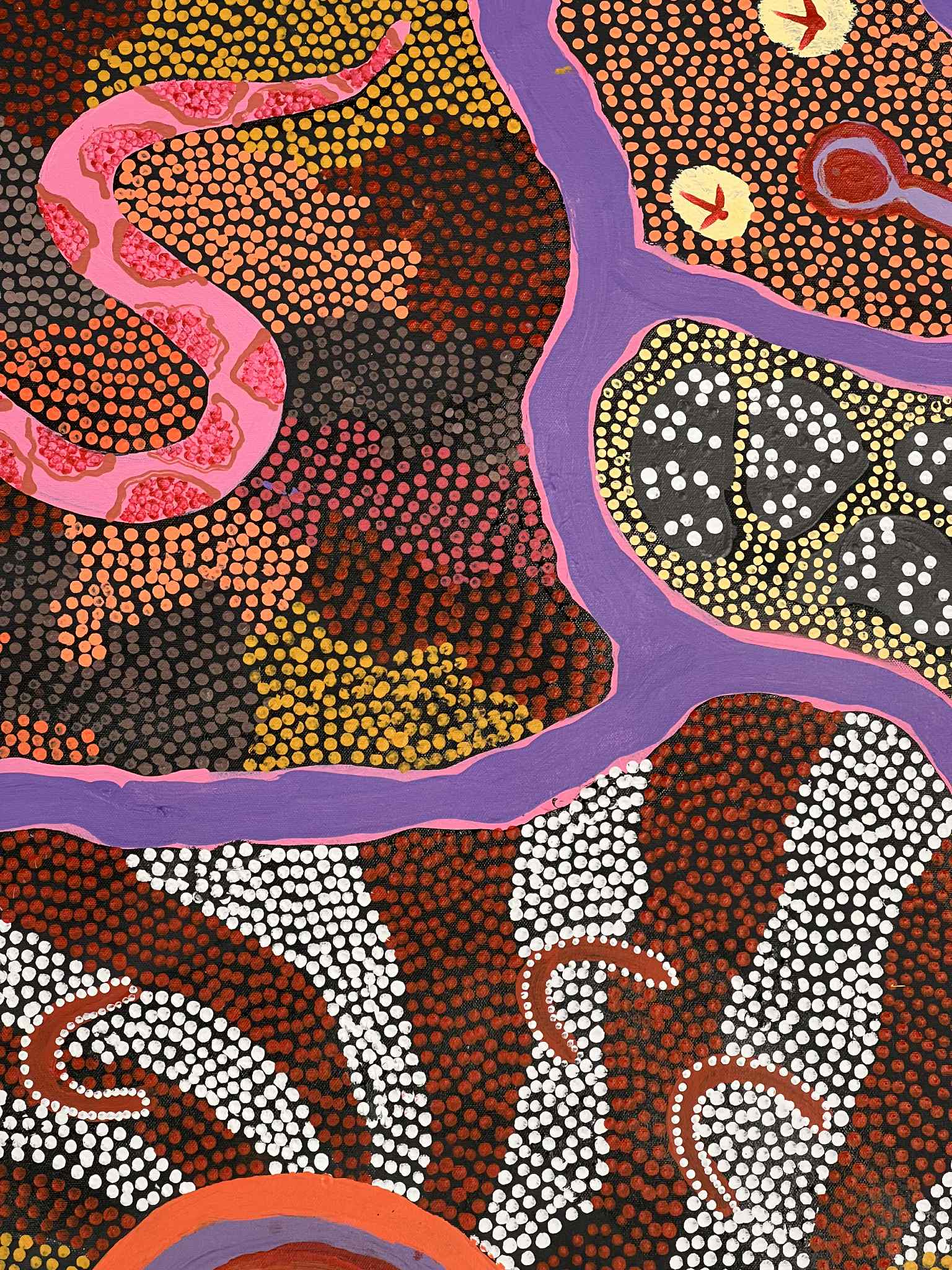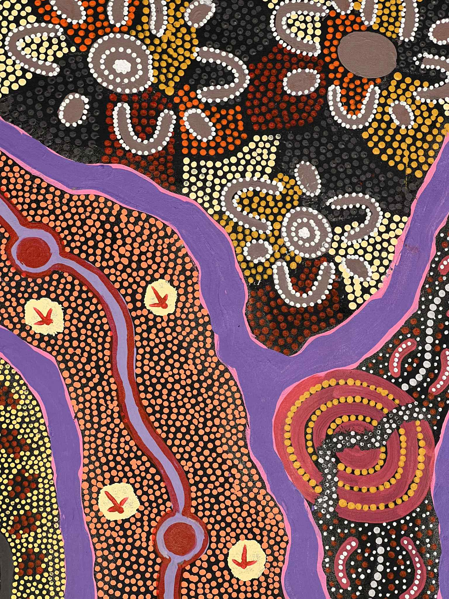 Maureen explained this painting was titled "Fire Dreaming", however would also be called Seven Stories as each section of the painting has its own story. This includes "Snake Dreaming", "Fire Dreaming", "Womens Ceremony", "Women hunting story", "Emu Dreaming", "Women Travelling" and "Bush Tucker".