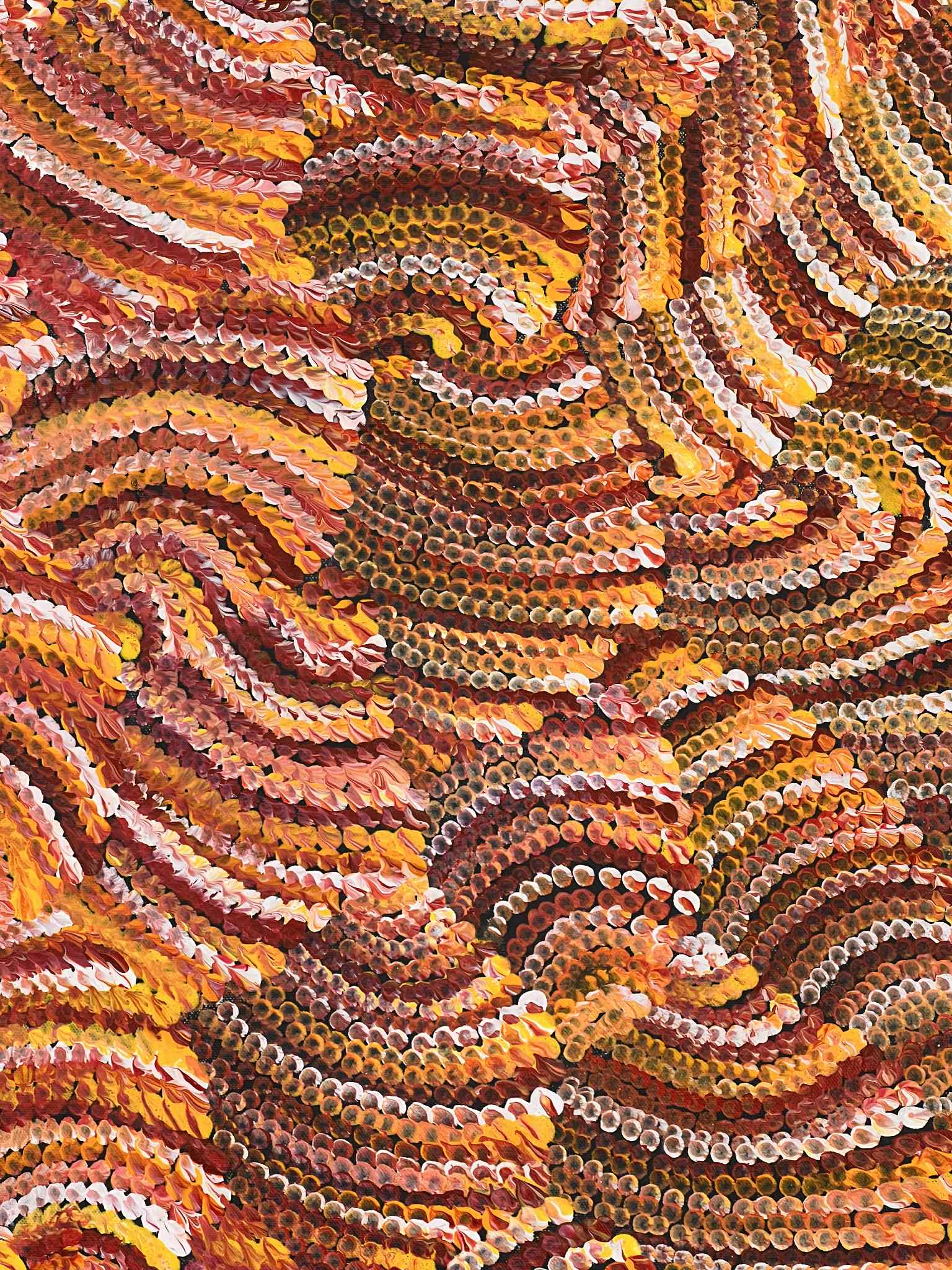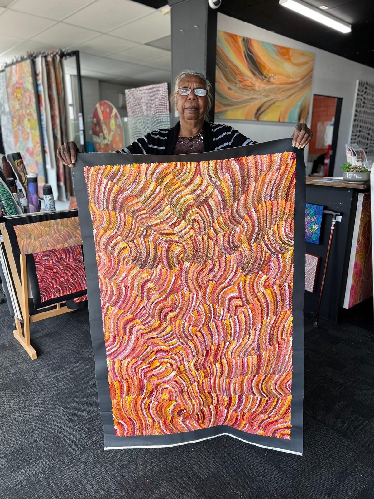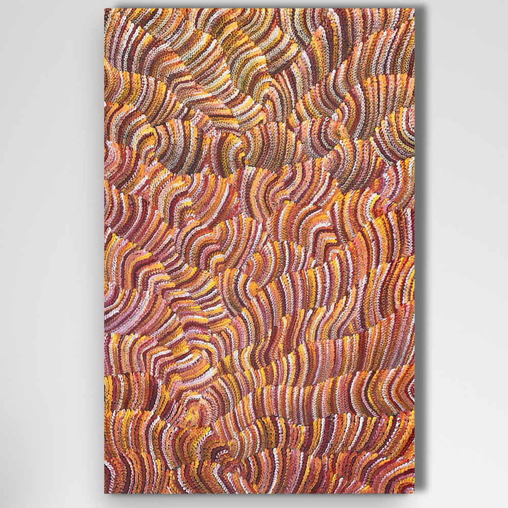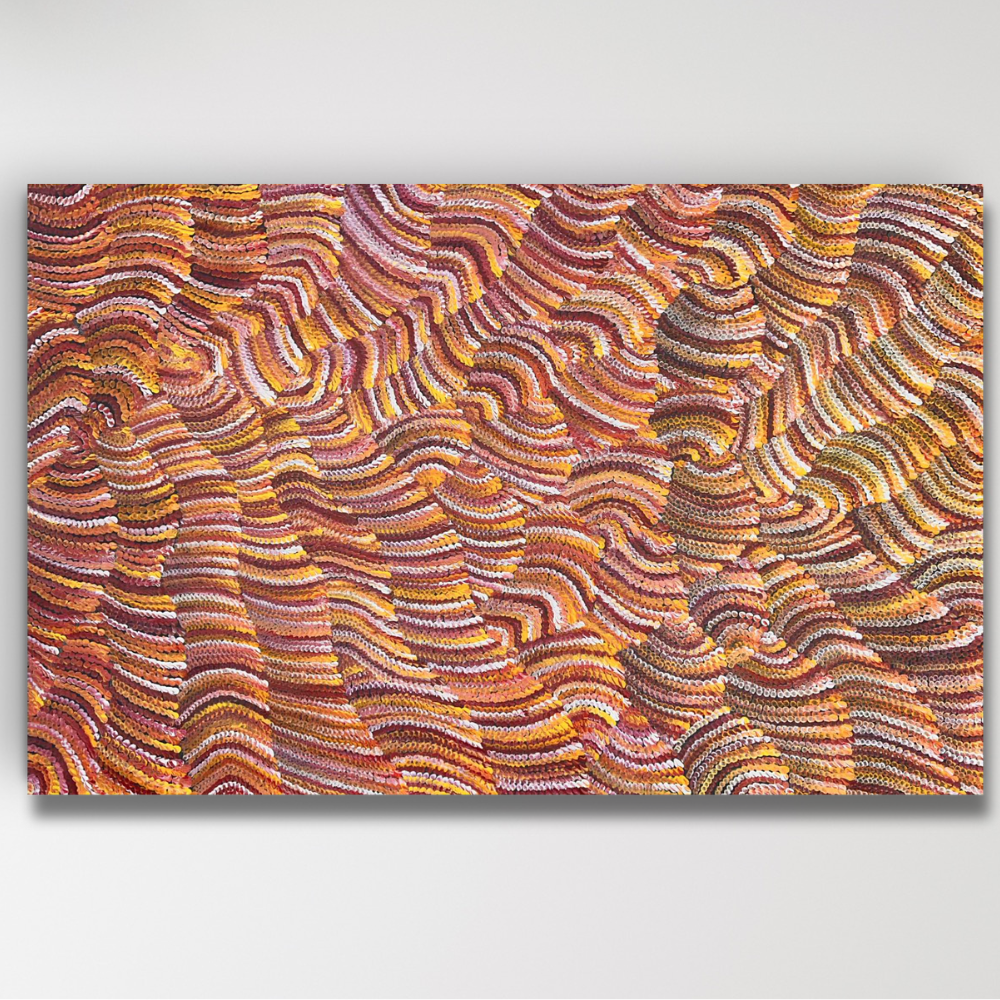 The inspiration behind this artwork stems from the sand dune landscape that defines Maureen's hometown in Yuelamu, situated to the North West of Alice Springs in the Tanami Region. Referred to as Tali in most of the Central Australian Aboriginal language groups, these sand formations are arranged in parallel rows, sculpted by the prevailing winds' direction.