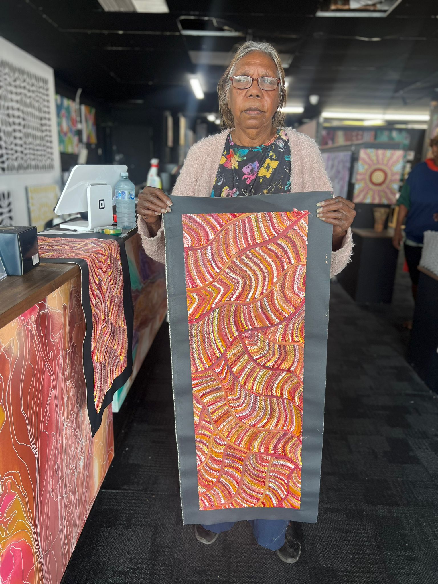 The inspiration behind this artwork stems from the sand dune landscape that defines Maureen's hometown in Yuelamu, situated to the North West of Alice Springs in the Tanami Region. Referred to as Tali in most of the Central Australian Aboriginal language groups, these sand formations are arranged in parallel rows, sculpted by the prevailing winds' direction.