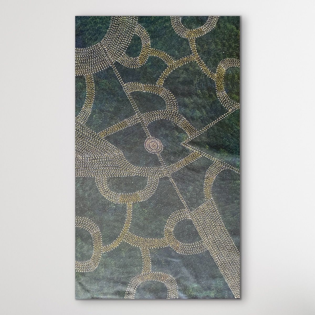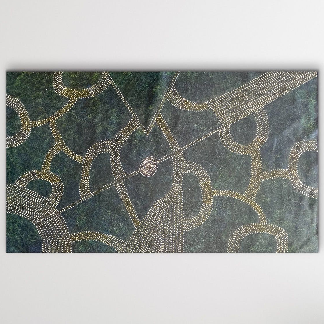 This paintings depict women journeying to gather Bush Plums. The dotted paths trace the routes they travel, while the smaller dotted sections represent areas where the bush plums grow. The larger, more colourful sections along the paths symbolise the matured flowers. At the centre, the circle signifies the meeting place where the women come together at the end of their journey to share and enjoy the food they have collected.