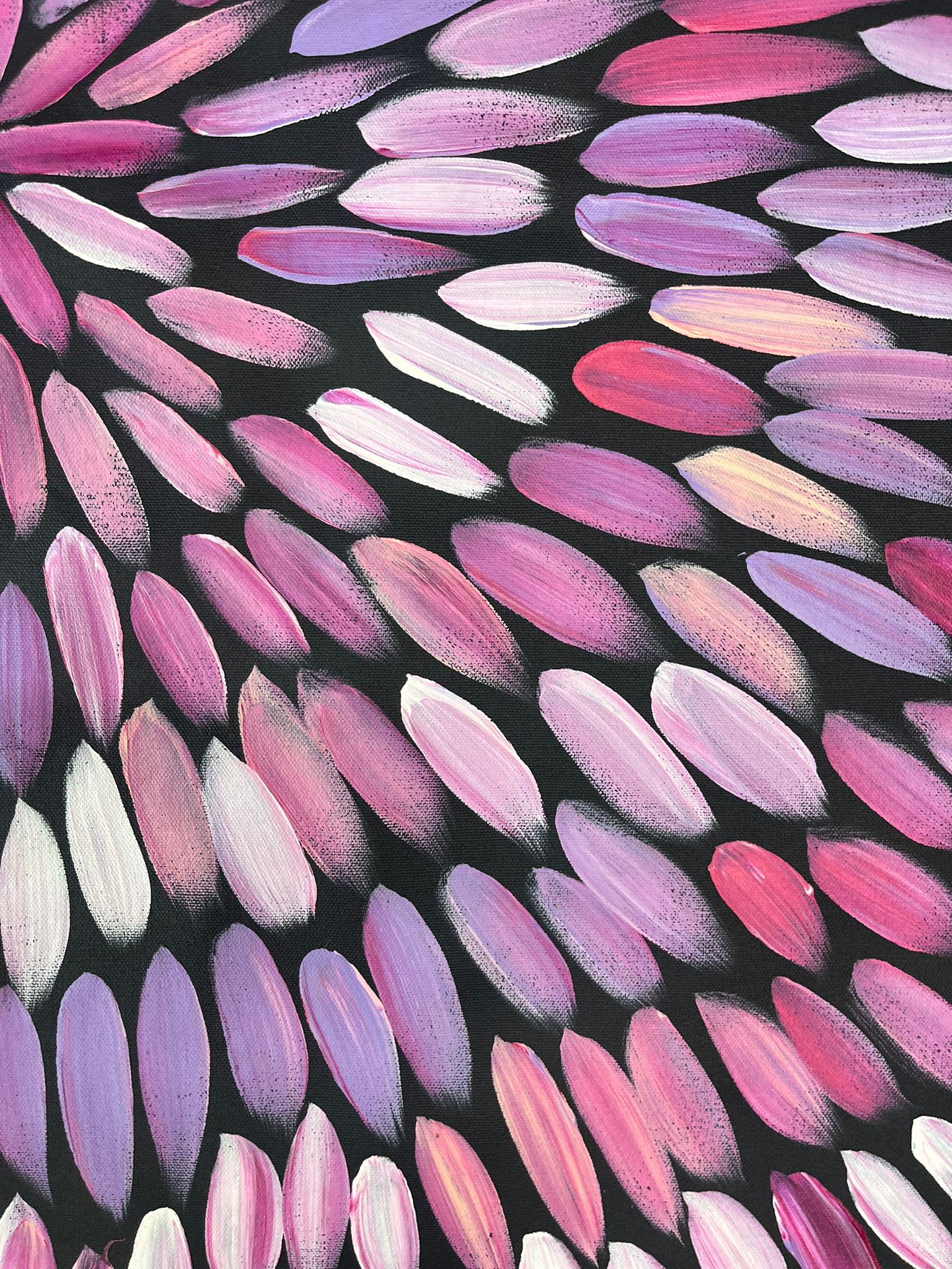 Medicine Leaves Indigenous Australian Art Tansy Martin 77cm x 73cm pink purple lilac painting displayed in modern home