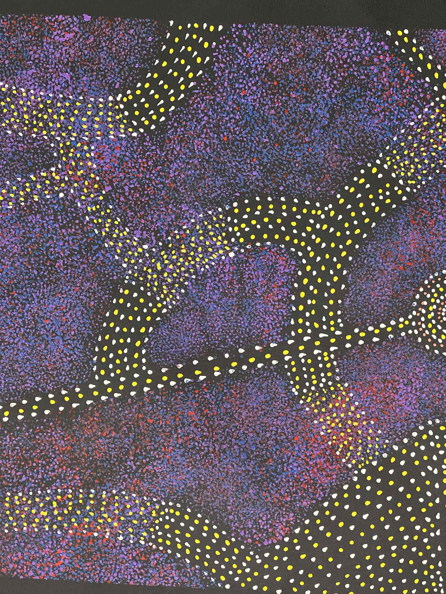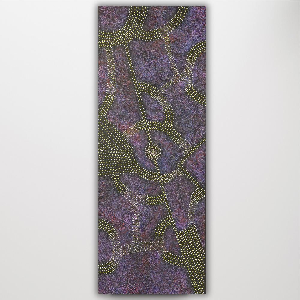 This paintings depict women journeying to gather Bush Plums. The dotted paths trace the routes they travel, while the smaller dotted sections represent areas where the bush plums grow. The larger, more colourful sections along the paths symbolise the matured flowers. At the centre, the circle signifies the meeting place where the women come together at the end of their journey to share and enjoy the food they have collected.