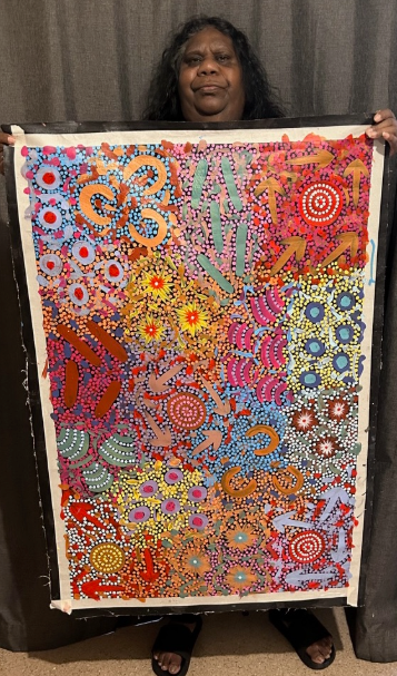 Original painting by Michelle Possum Nungurrayi (Mt. Allan, N.T). Michelle is daughter to Emily Nakamarra Possum and Clifford Possum Tjapaltjarri, who is considered to be one of the most collected and renowned Australian Aboriginal artists.