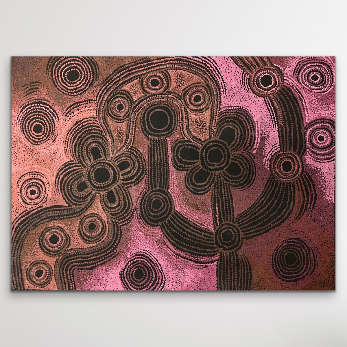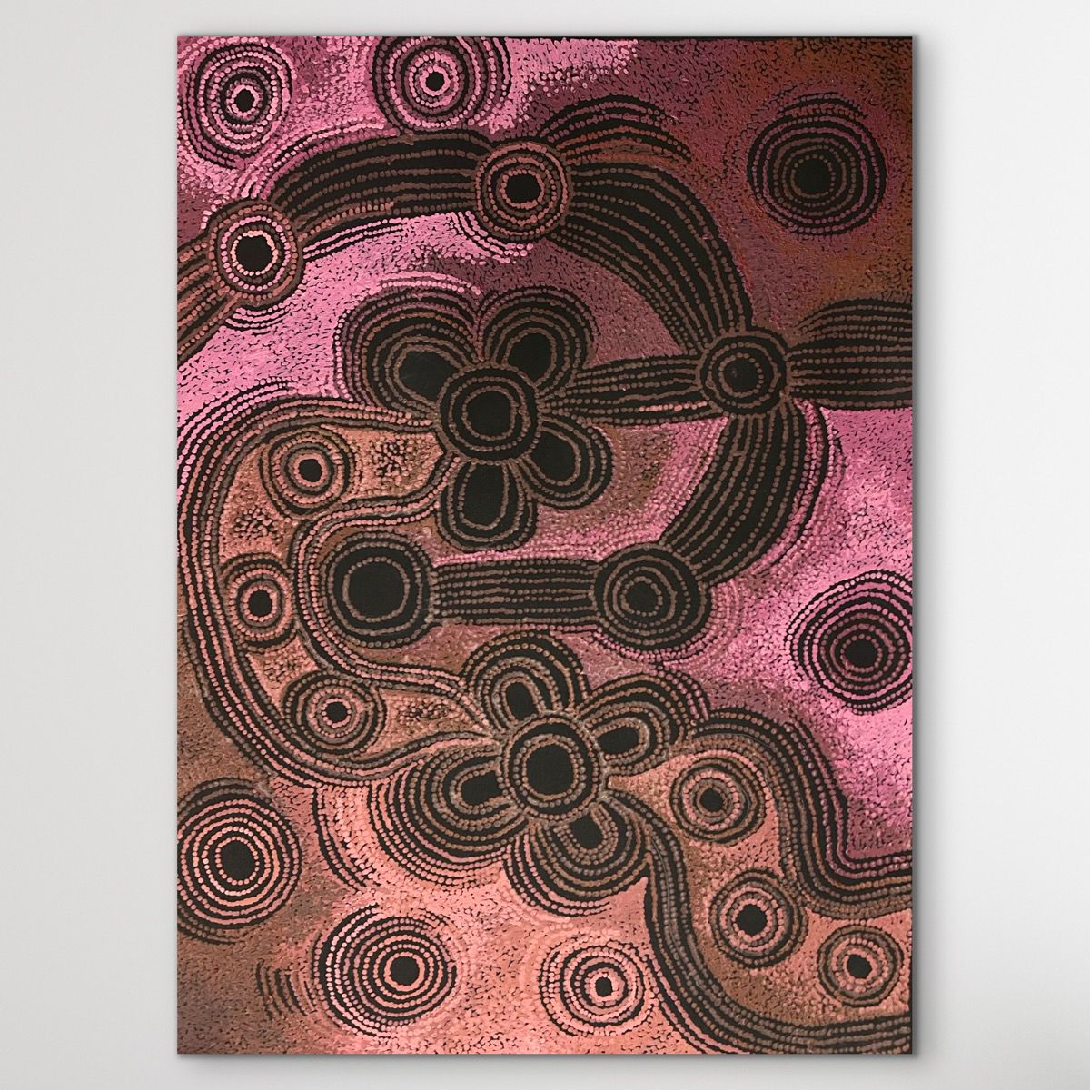 Rooted in Dreamtime traditions, her dot paintings merge Anangu heritage with contemporary design, continuing the family legacy of Jimmy Baker and Kay Baker within the Western Desert art movement.