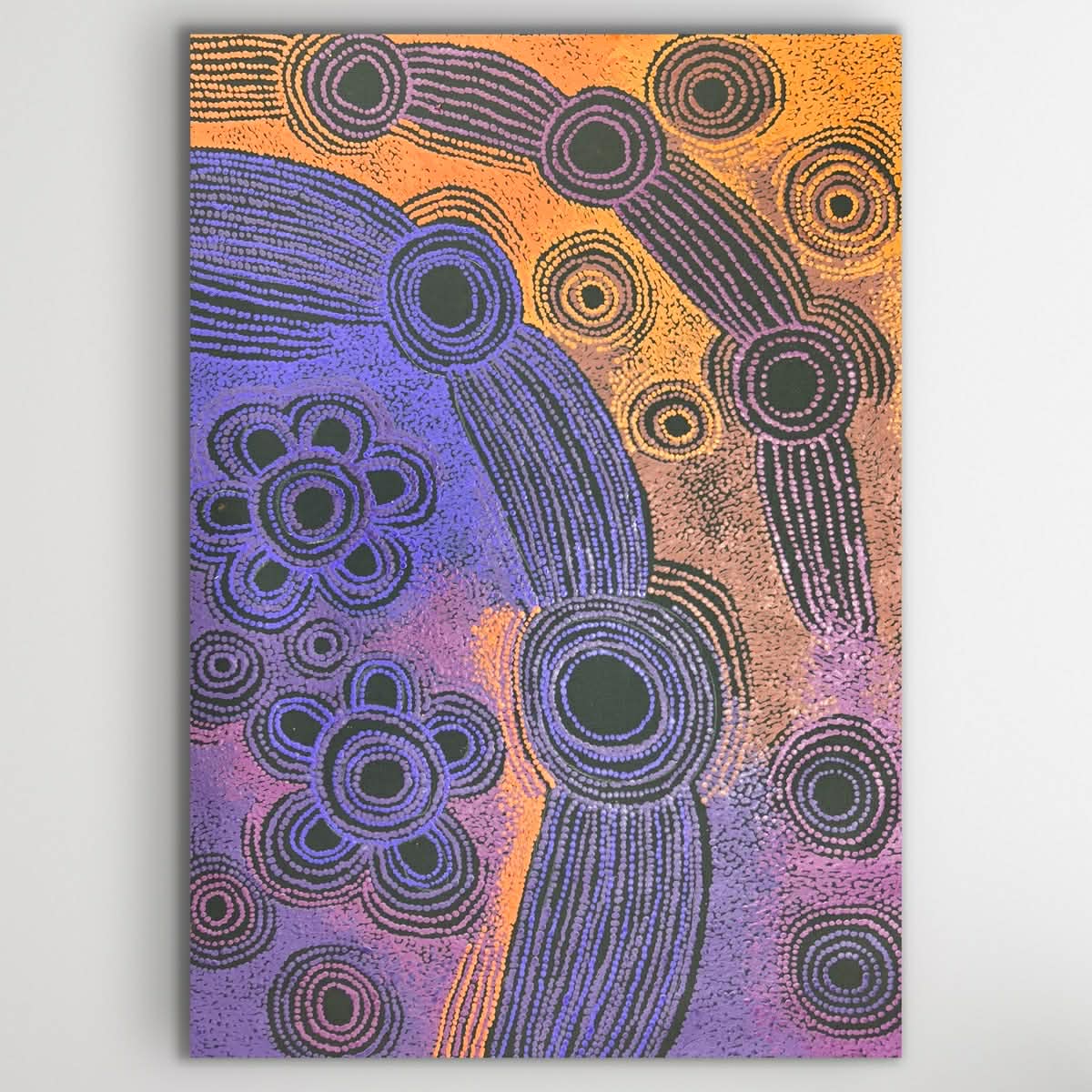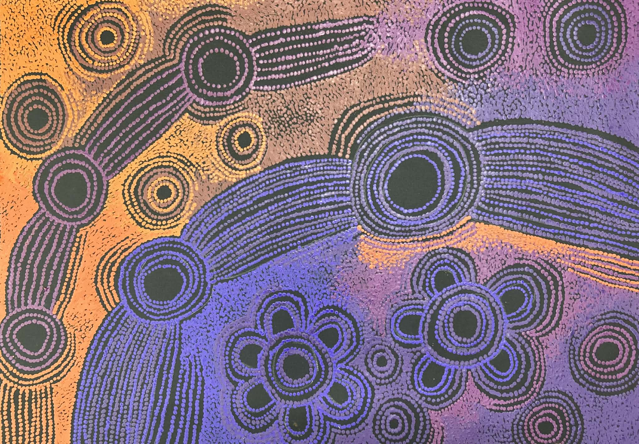 Rooted in Dreamtime traditions, her dot paintings merge Anangu heritage with contemporary design, continuing the family legacy of Jimmy Baker and Kay Baker within the Western Desert art movement.
