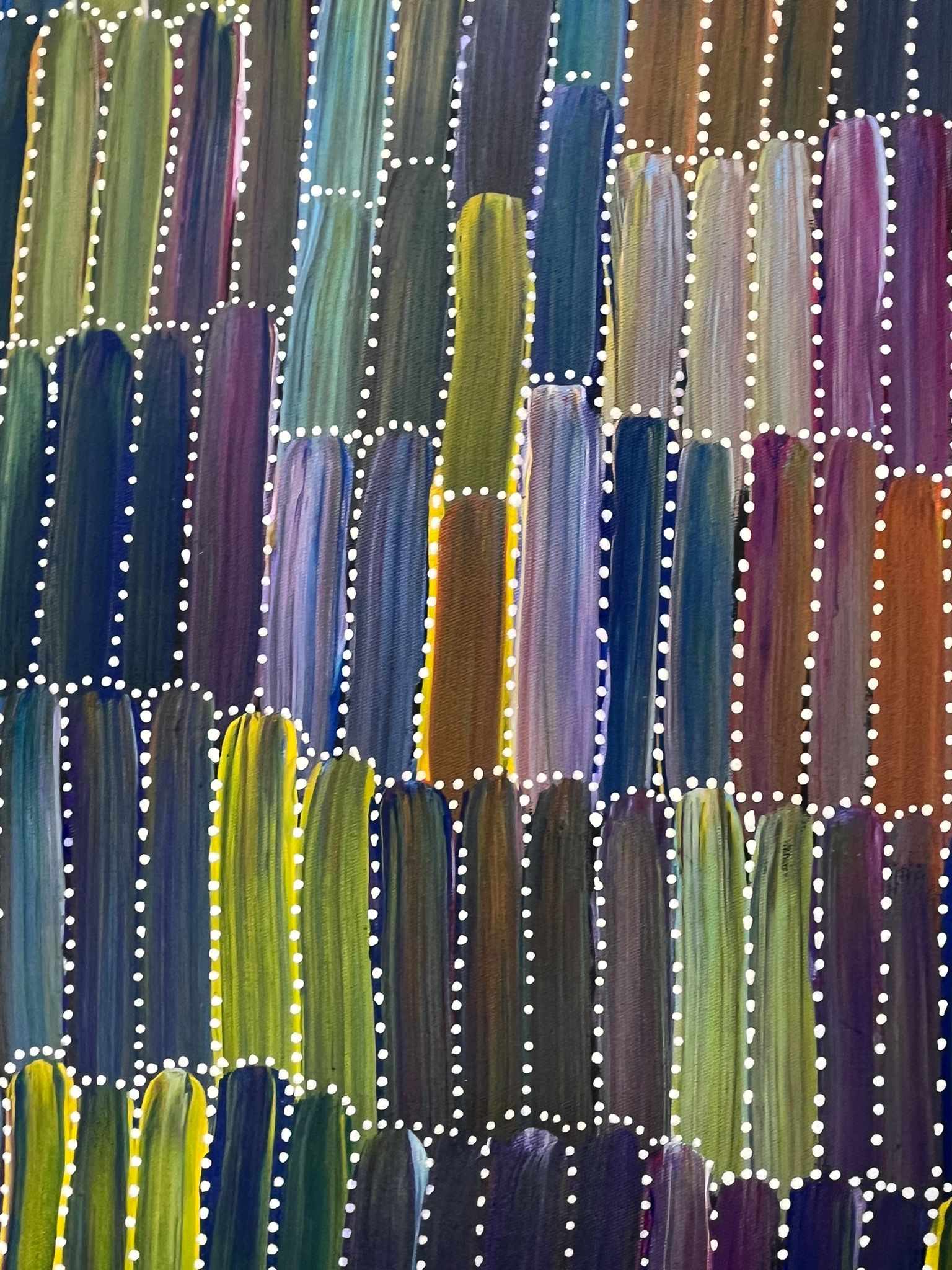 Jeannies palette is bright and bold and each piece has a slightly different range on the canvas. Each stroke may contain two or three colours which are painted precisely which comes together to create a flowing and eye catching piece to represent Bush yam.