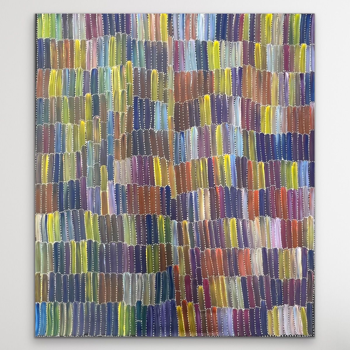 Her "Yam Dreaming" paintings are well recognised in the Indigenous art world. The seed of the yam is represented with the fine white dots and the colourful brush stroked represent the vegetable and its impressive root system. The desert yam has always been an important food source in Central Australia and can be eaten raw or cooked. It has an impressive root system and commonly found in the woodland areas. Artist paint desert yams to pay homage to the significance of this plant women often perform ceremonies to show respect and encourage growth of the Desert Yam.