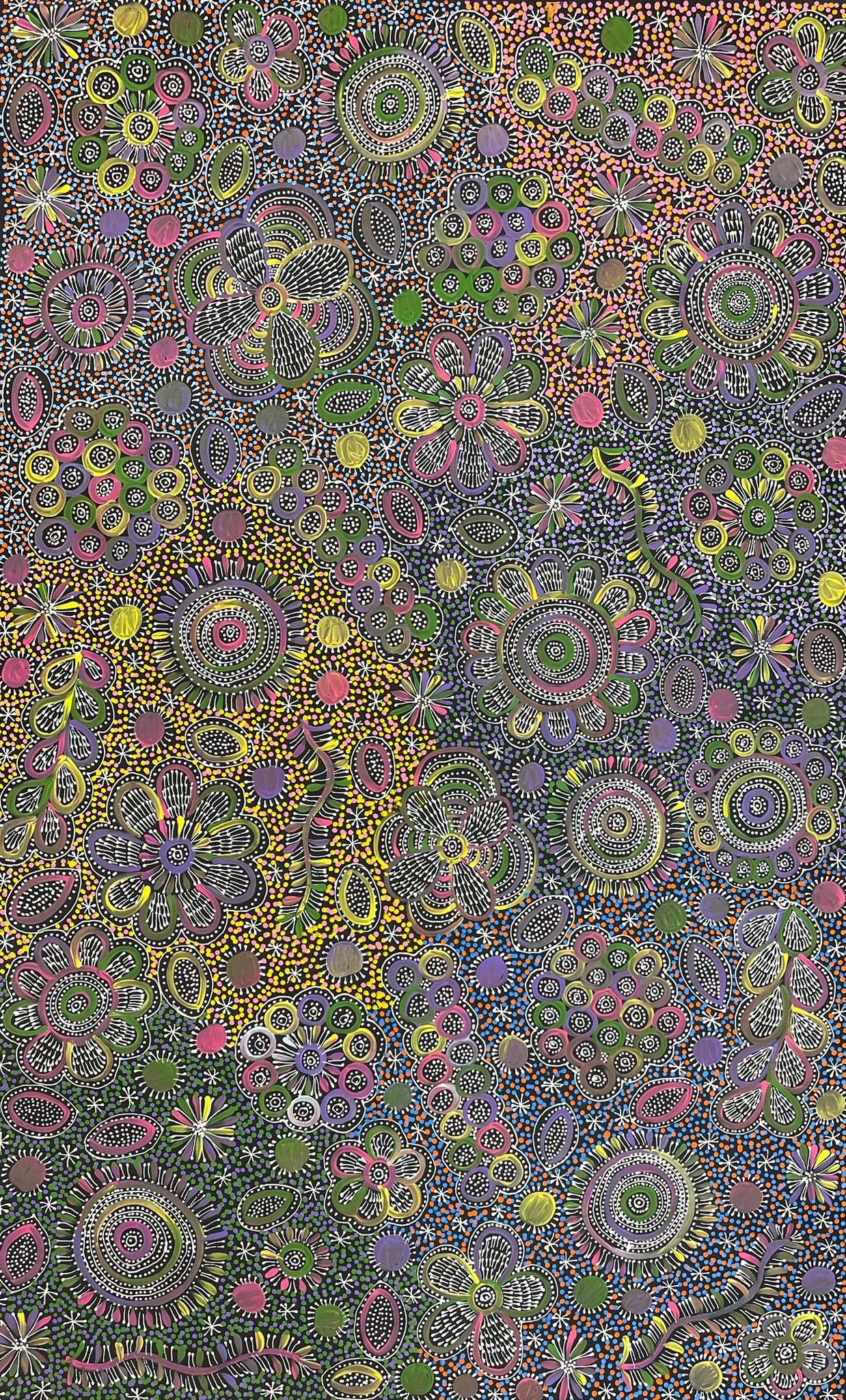 Aboriginal painting Belinda Golder Kngwarreye 154cm x 94cm My Country displayed on white wall featuring flowers, seeds and bush tuckers from Utopia full images lots of colour