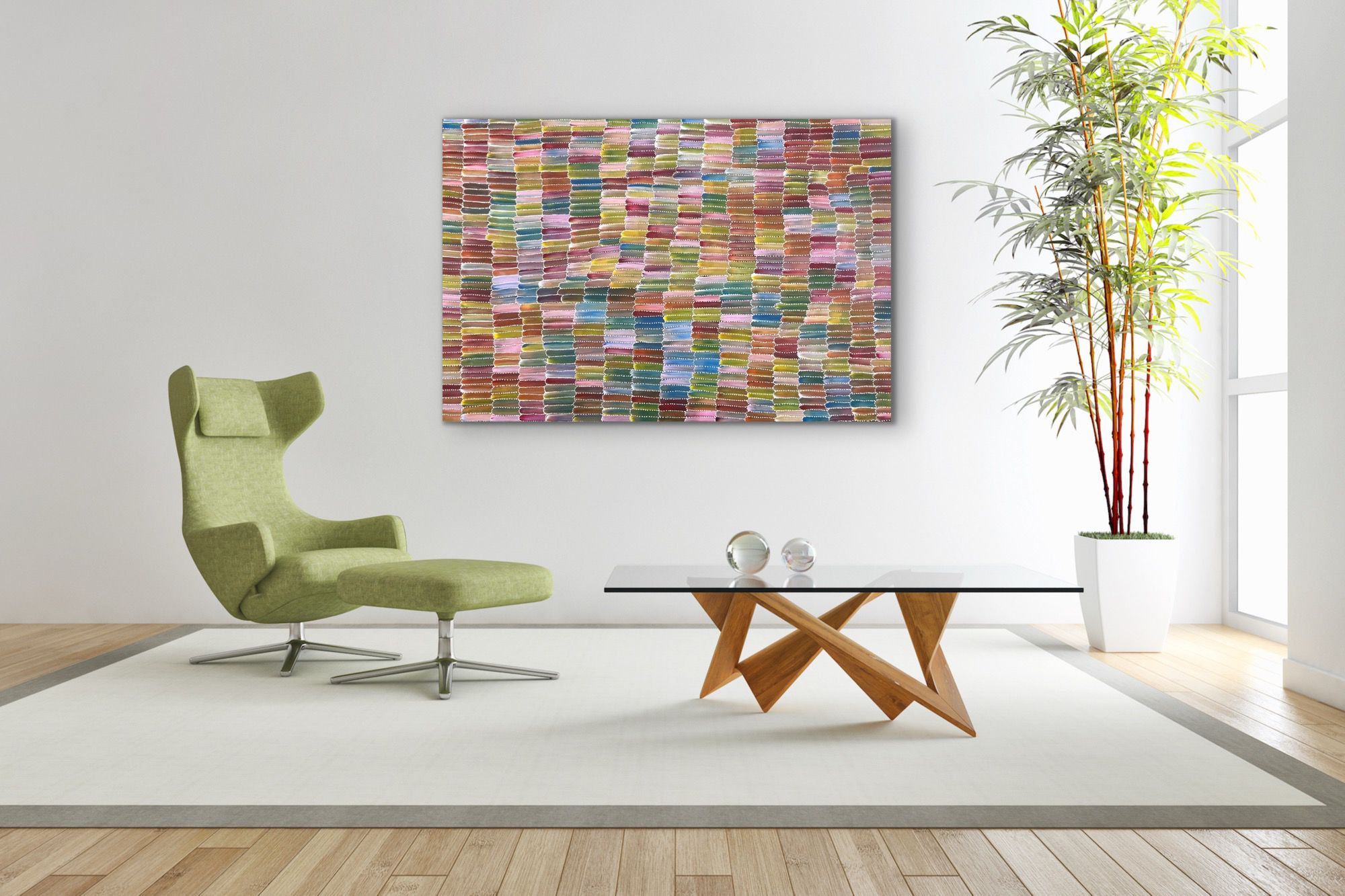 Jeannies palette is bright and bold and each piece has a slightly different range on the canvas. Each stroke may contain two or three colours which are painted precisely which comes together to create a flowing and eye catching piece to represent Bush yam.