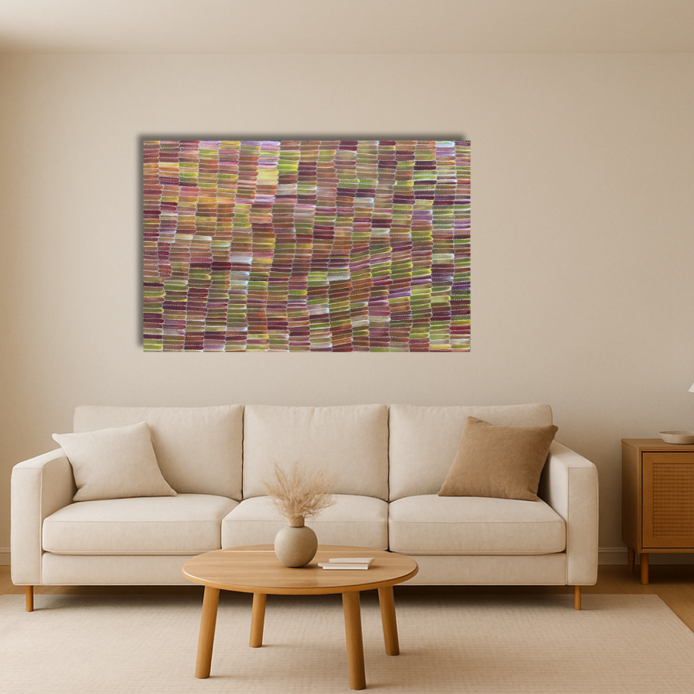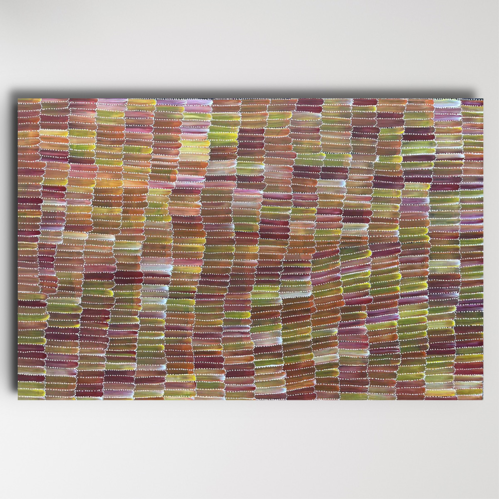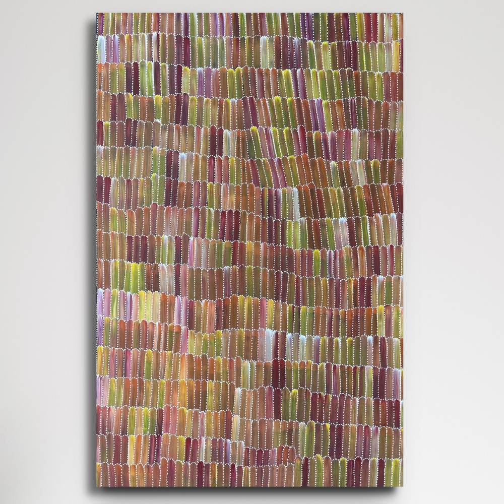 Jeannies palette is bright and bold and each piece has a slightly different range on the canvas. Each stroke may contain two or three colours which are painted precisely which comes together to create a flowing and eye catching piece to represent Bush yam.