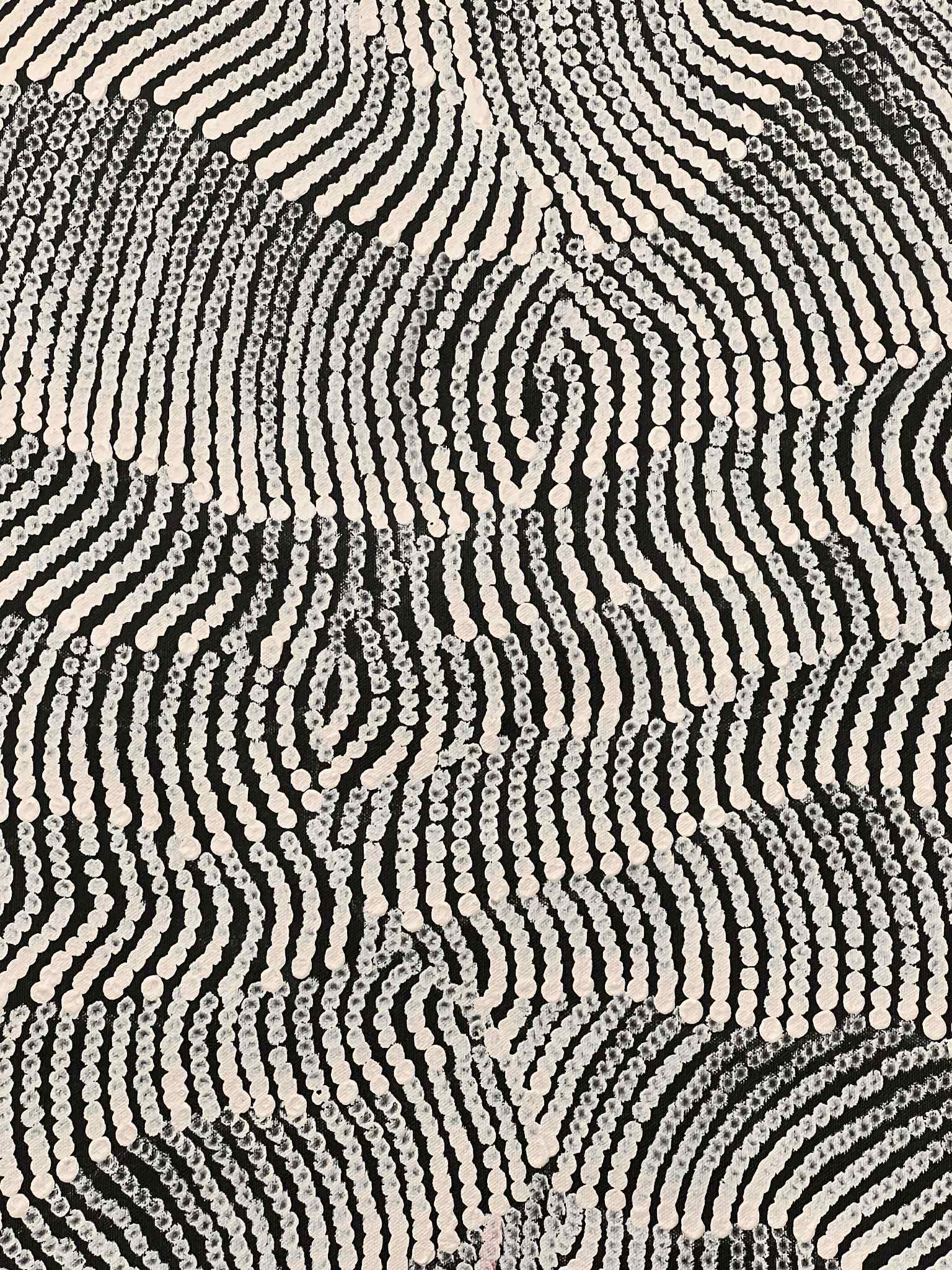 The inspiration behind this artwork stems from the sand dune landscape that defines Maureen's hometown in Yuelamu, situated to the North West of Alice Springs in the Tanami Region. Referred to as Tali in most of the Central Australian Aboriginal language groups, these sand formations are arranged in parallel rows, sculpted by the prevailing winds' direction.