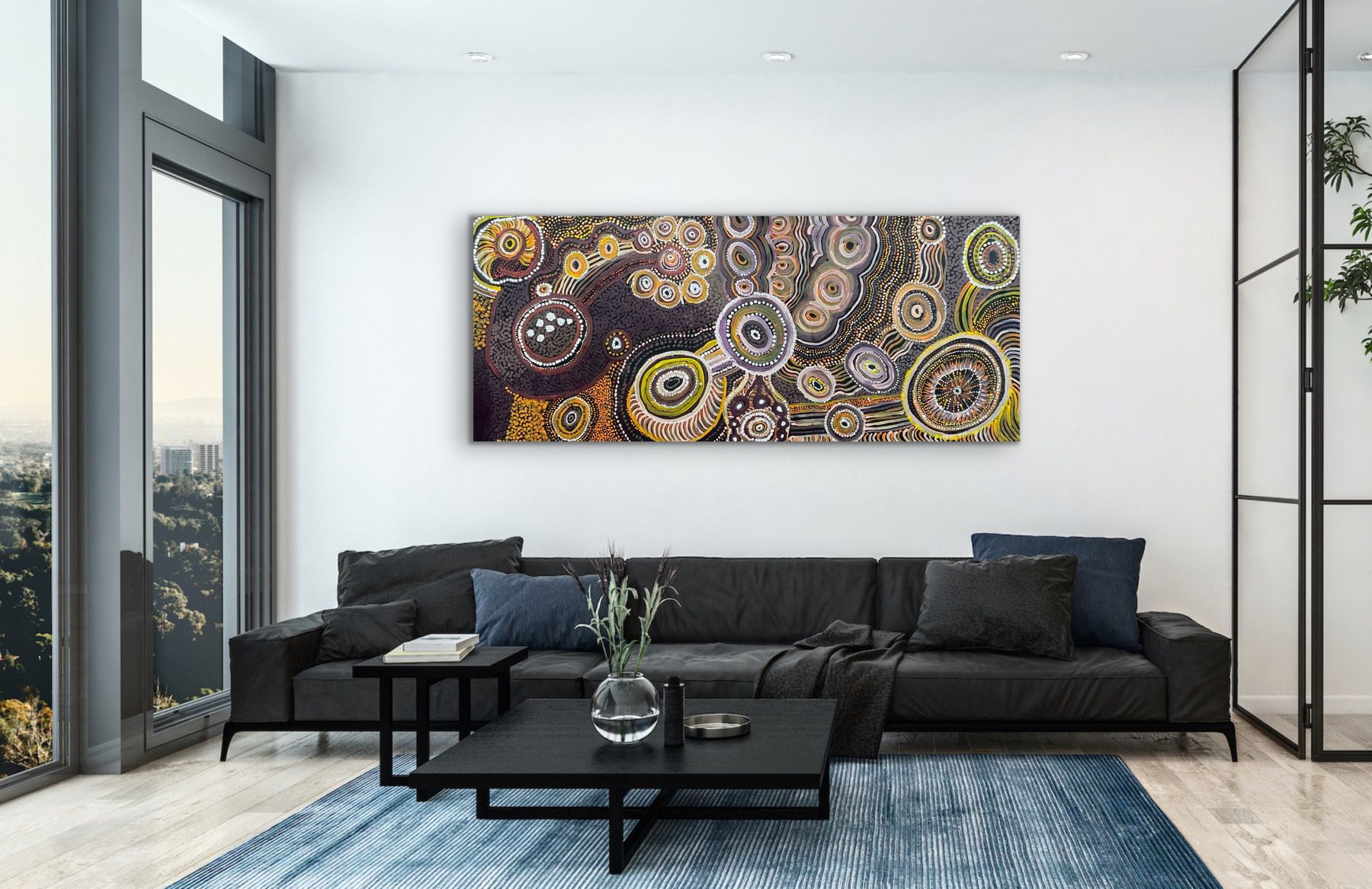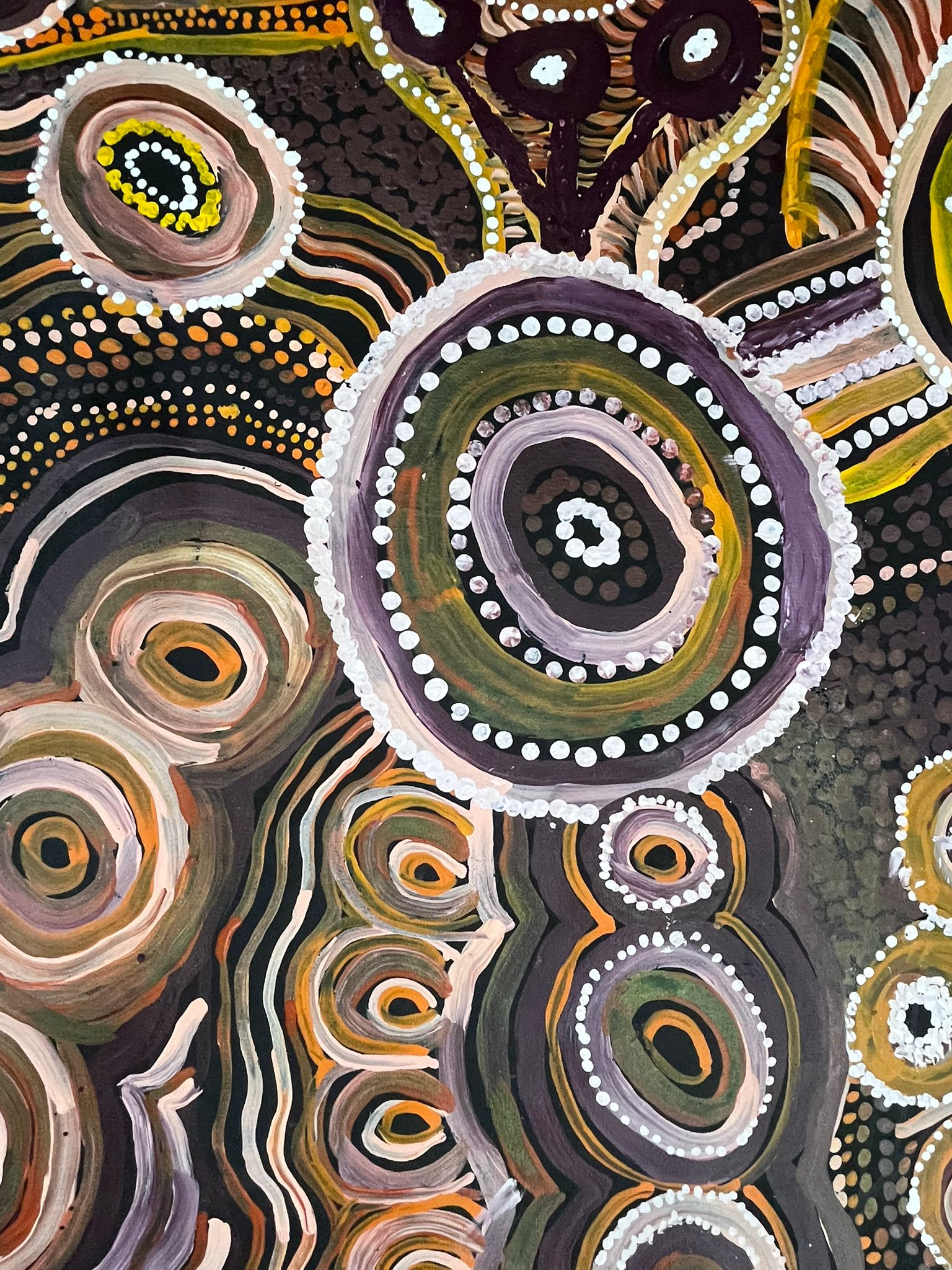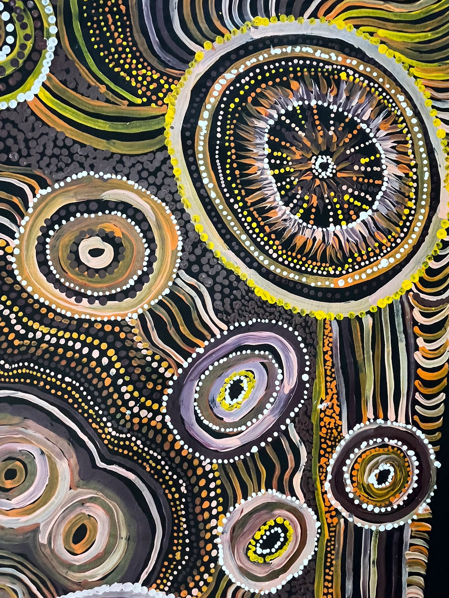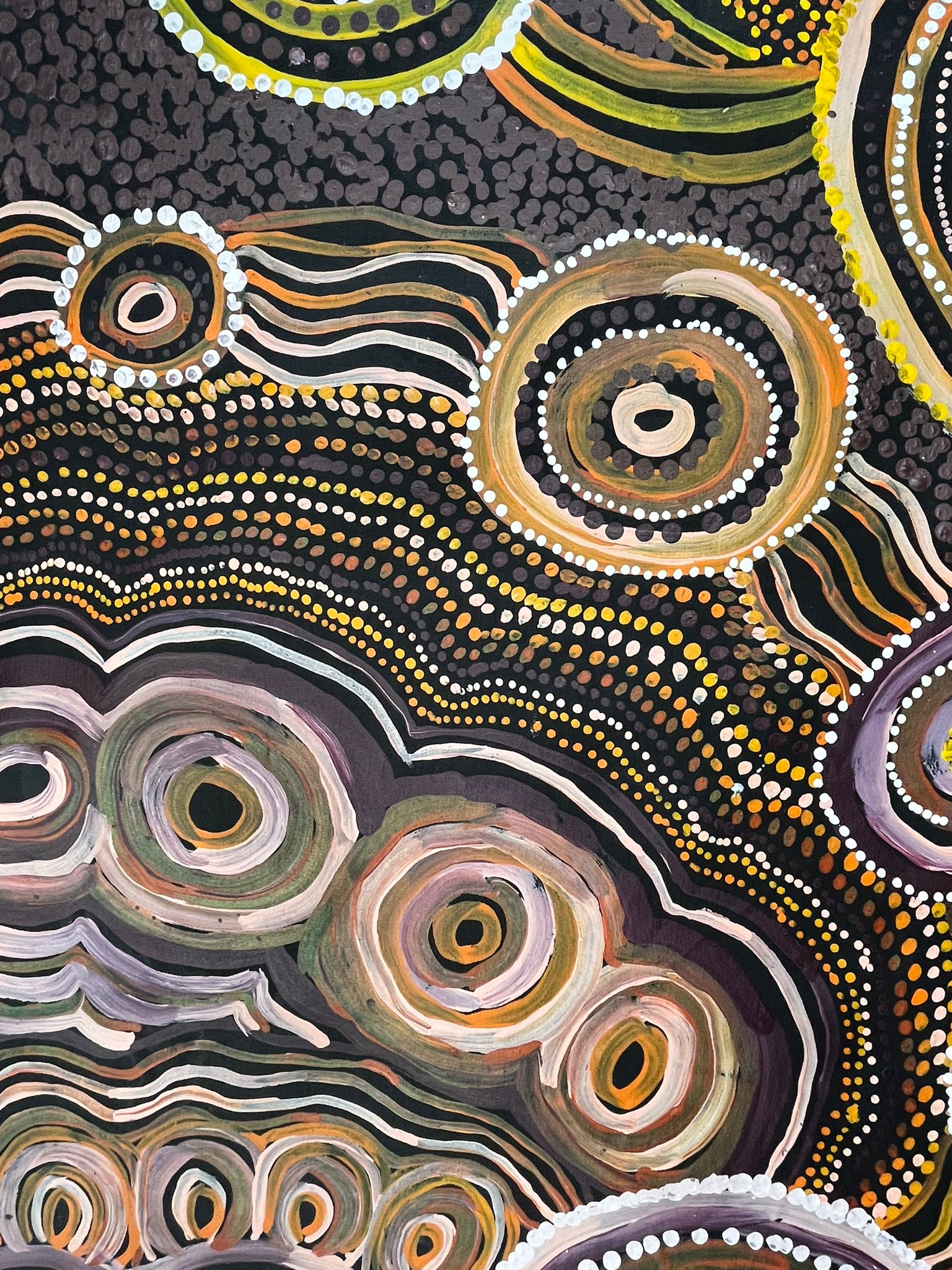 "Tanya paints the timeless tale of the Seven Sisters, a captivating Tjukurpa (Creation) story that reveals the celestial connection between the Pleiades constellation and the notorious figure known as Nyiru, the malevolent antagonist. As the sisters embarked on their journey westward, Nyiru caught sight of them and became captivated by their beauty. Despite being of a different kinship group, Nyiru yearned to possess them desperately.